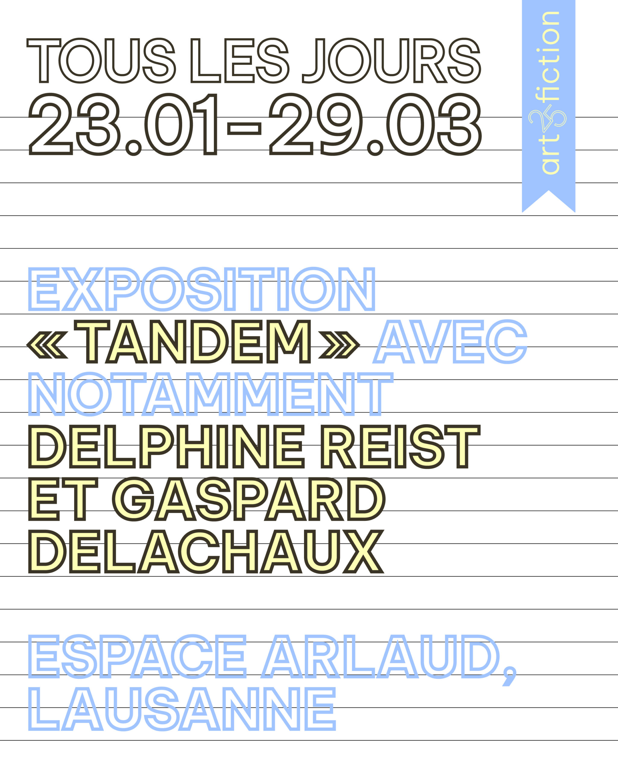 20 artistes – 10 binômes: Delphine Reist avec Adrian Fernandez Garcia // Gaspard Delachaux avec Achille Meier // Danièle Mussard avec Sonja Jokiniemi // Geneviève Capitanio avec Rayane Rafik Jemaa // Pierre Schwerzmann avec Hadrien Dussoix // Delphine Sandoz avec Ysé Willemin // Olivier Estoppey avec Frédéric Clot // Isabelle Tanner avec Michèle Rochat // Bernard Henri Desrousseaux avec Maeva Rosset // Saïd Farhan avec Sherian Mohammed Forster