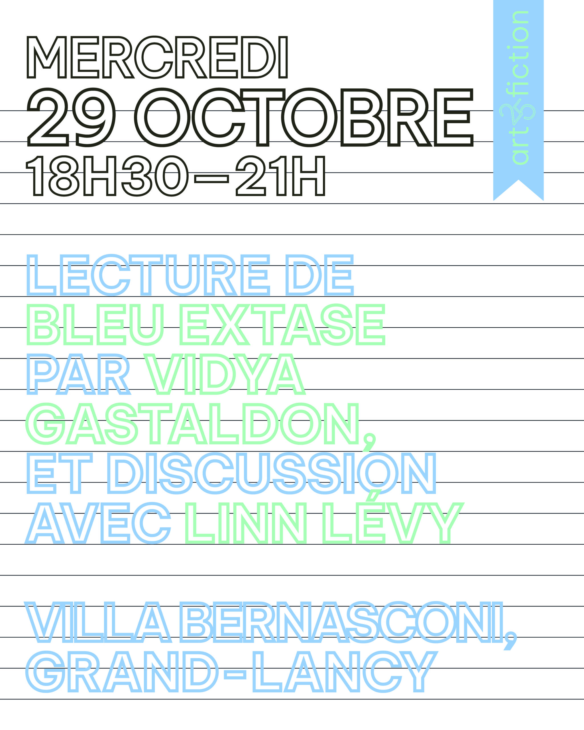 Au programme de cette soirée: ☞ 18h30 lecture de Vidya Gastaldon d’extraits de son premier roman Bleu Extase, suivie d’une discussion avec Linn Levy ☞ 19h30 session d’écoute d’une œuvre sonore réalisée in situ par Emilie Ding et Alizée Lenox ☞ 20h30 performance sonore de Tobias Koch