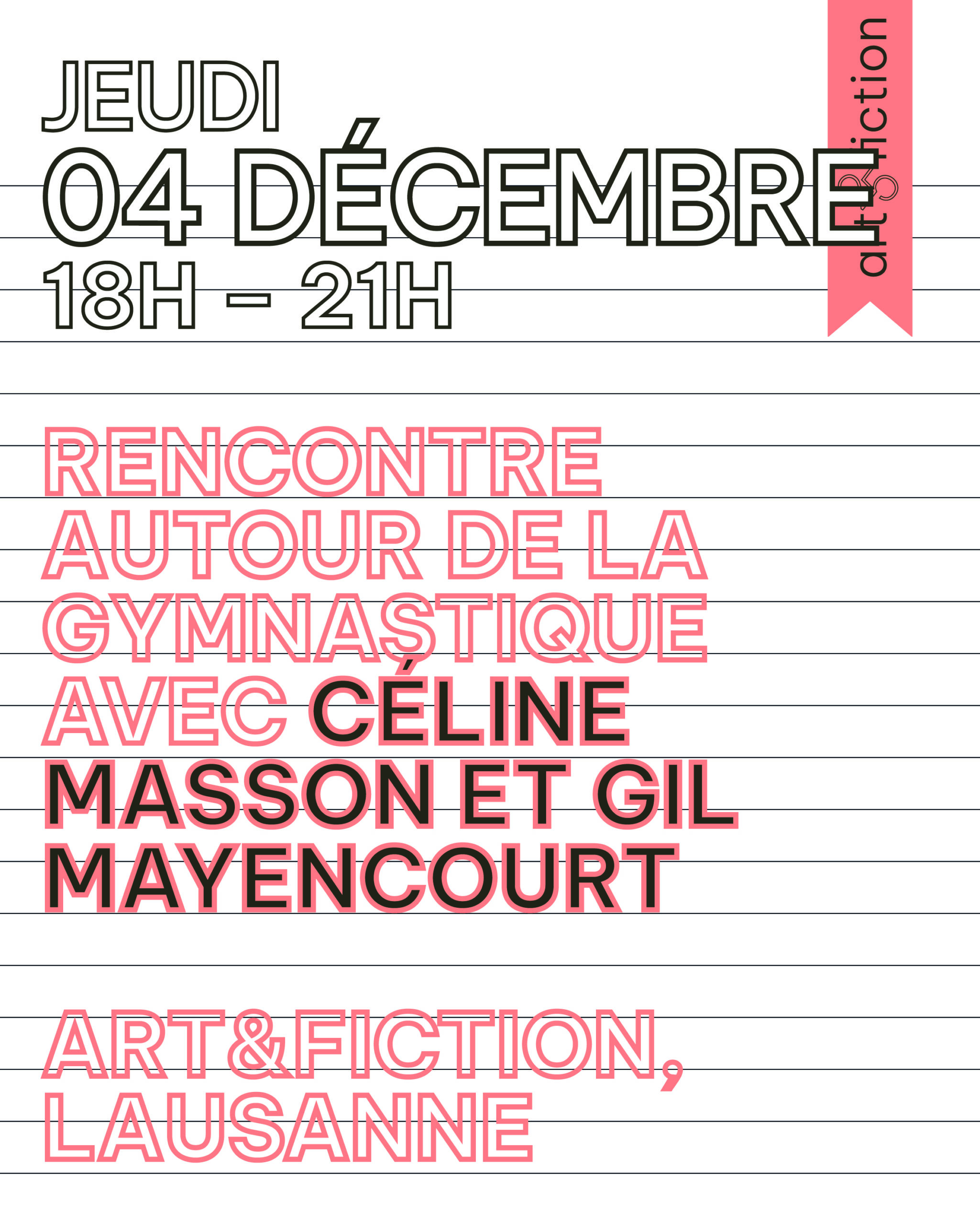 Nous sommes heureux·ses de vous convier en salle France 16, muni·es de vos sautoirs et cerceaux, le jeudi 4 décembre à 18h avec l’artiste Céline Masson et l’historien Gil Mayencourt, pour une discussion sur ces questions menée au tambourin par Allison Huetz. L’occasion nous est donnée par deux récentes publications: Zone disputée (a&f, 2025), de Céline Masson, qui aborde la gymnastique d’un point de vue intime et autobiographique et Faire nation en faisant de la gymnastique (Alphil, 2025), de Gil Mayencourt, qui – dans le cadre de la publication de sa thèse de doctorat – en propose une histoire sociale et politique.