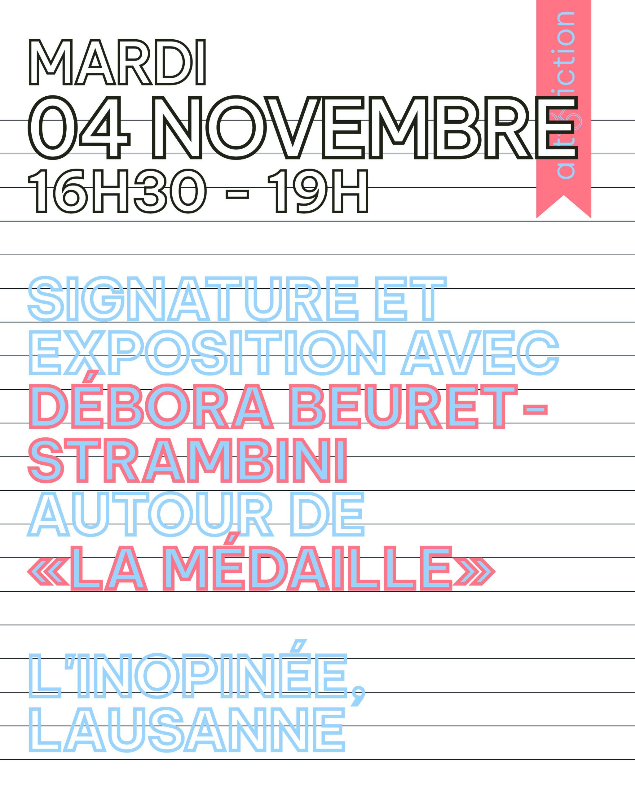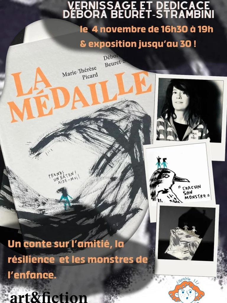 art&fiction est très heureux de vous inviter au vernissage de l’exposition La Médaille à la librairie L’Inopinéele 4 novembre de 16h30 à 19h! Venez partager un moment convivial autour d’un apéritif avec l’autrice Débora Beuret-Strambini et découvrir son magnifique travail.