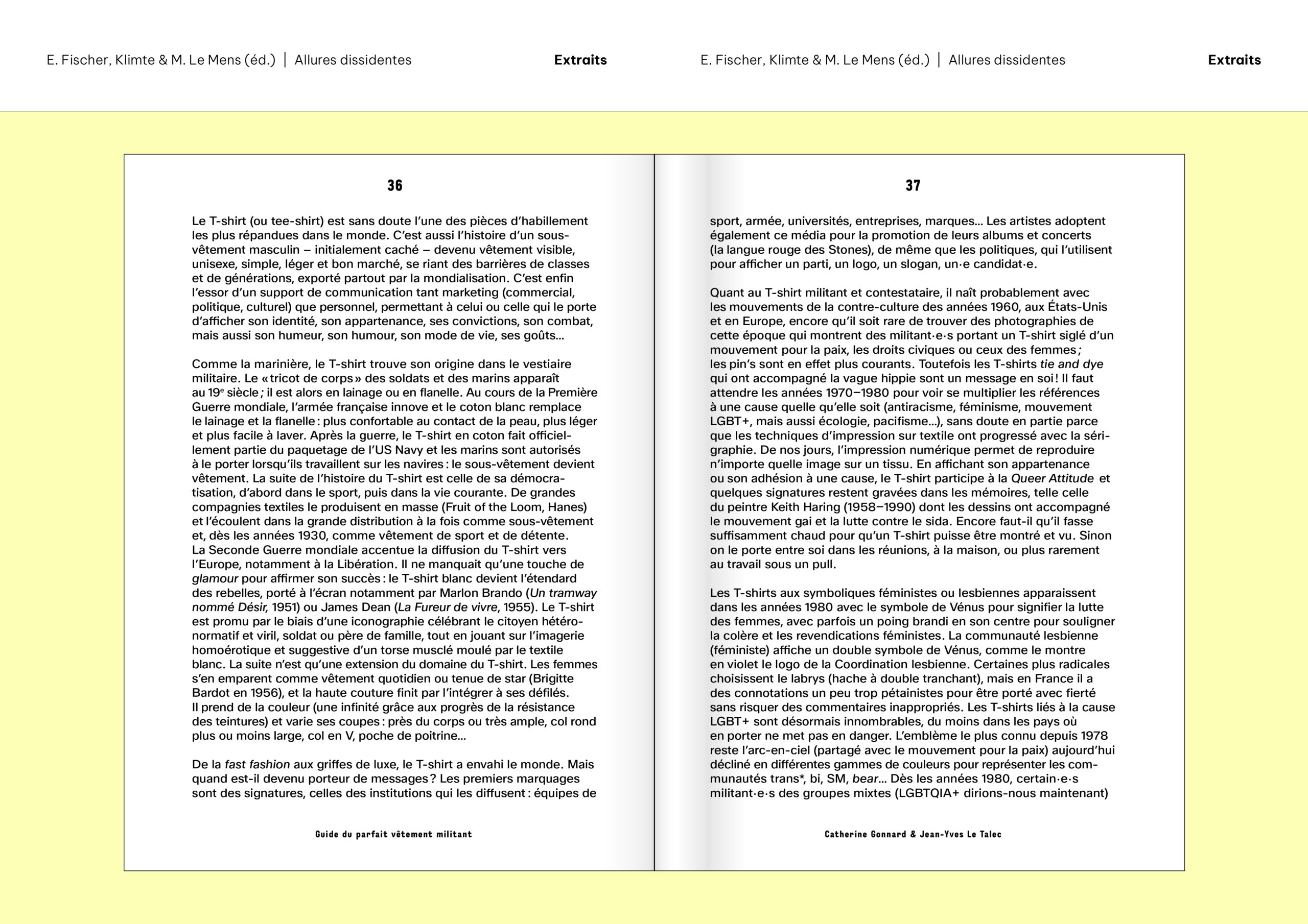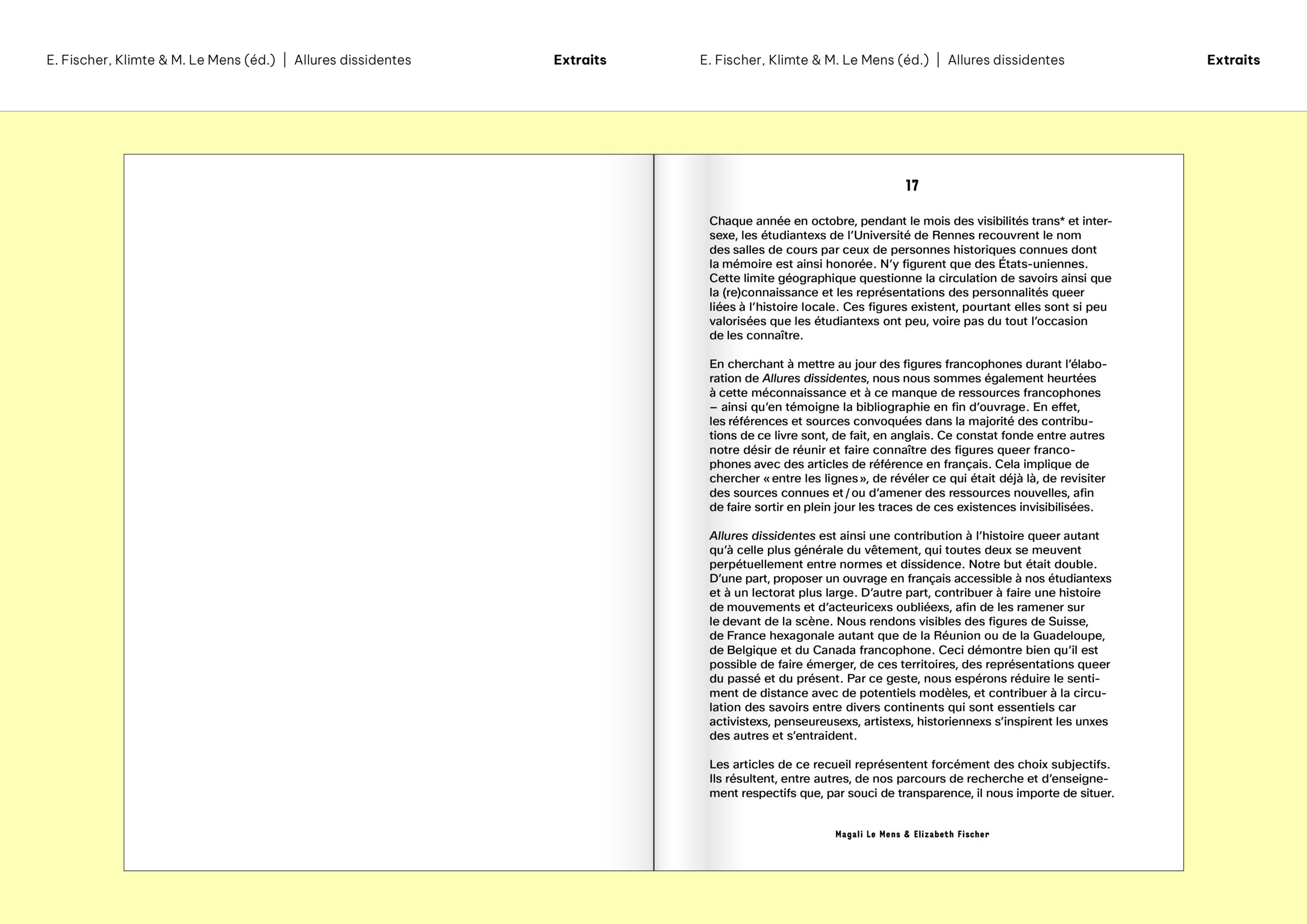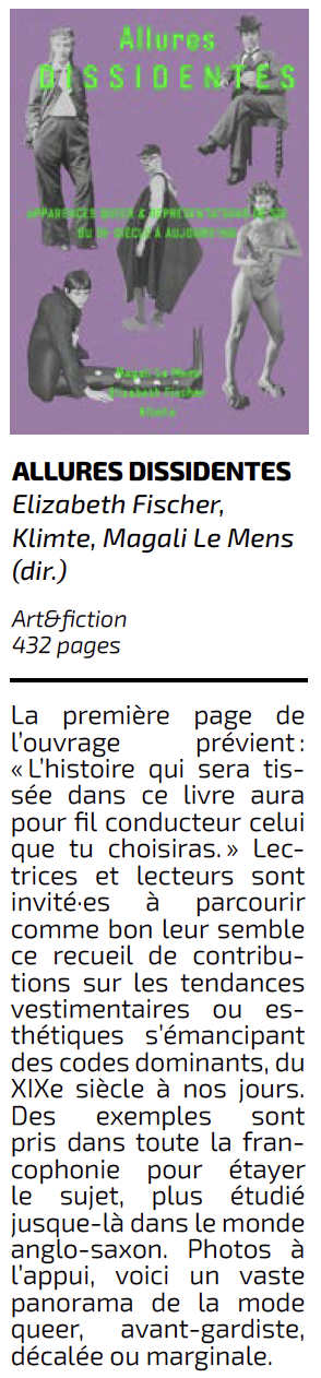 Allures dissidentes retrace l’histoire culturelle et matérielle des apparences du 19e siècle à aujourd’hui. Tous les jours, en nous habillant, en nous coiffant, en nous chaussant, nous créons, sans en avoir forcément conscience, des allures. Le livre aborde les stratégies historiques et actuelles de personnes queer ou non, qui sortent des codes dominants et négocient avec les normes binaires occidentales. Portant son attention sur la Suisse, la Belgique, le Canada, la France métropolitaine, la Guadeloupe et la Réunion, cet ouvrage propose des articles de référence, en français, pour élargir un champ d’études encore dominé par les ressources anglophones. Ce livre n’est pas une encyclopédie qui enferme et fige les définitions, mais un patchwork de récits qui invite celleux qui s’intéressent à la mode, au genre et aux cultures queer, à se saisir du contenu et à créer leur propre lecture.