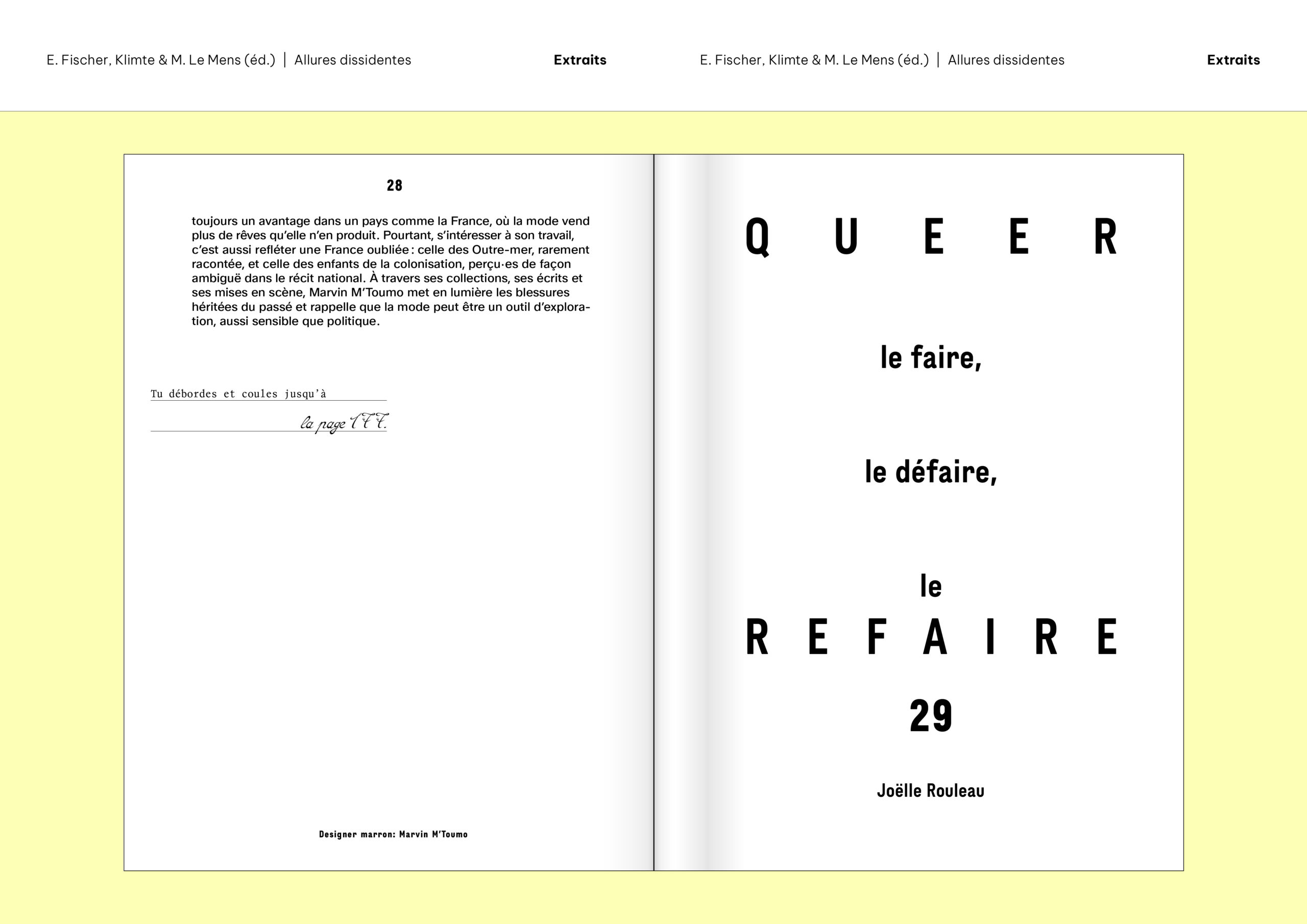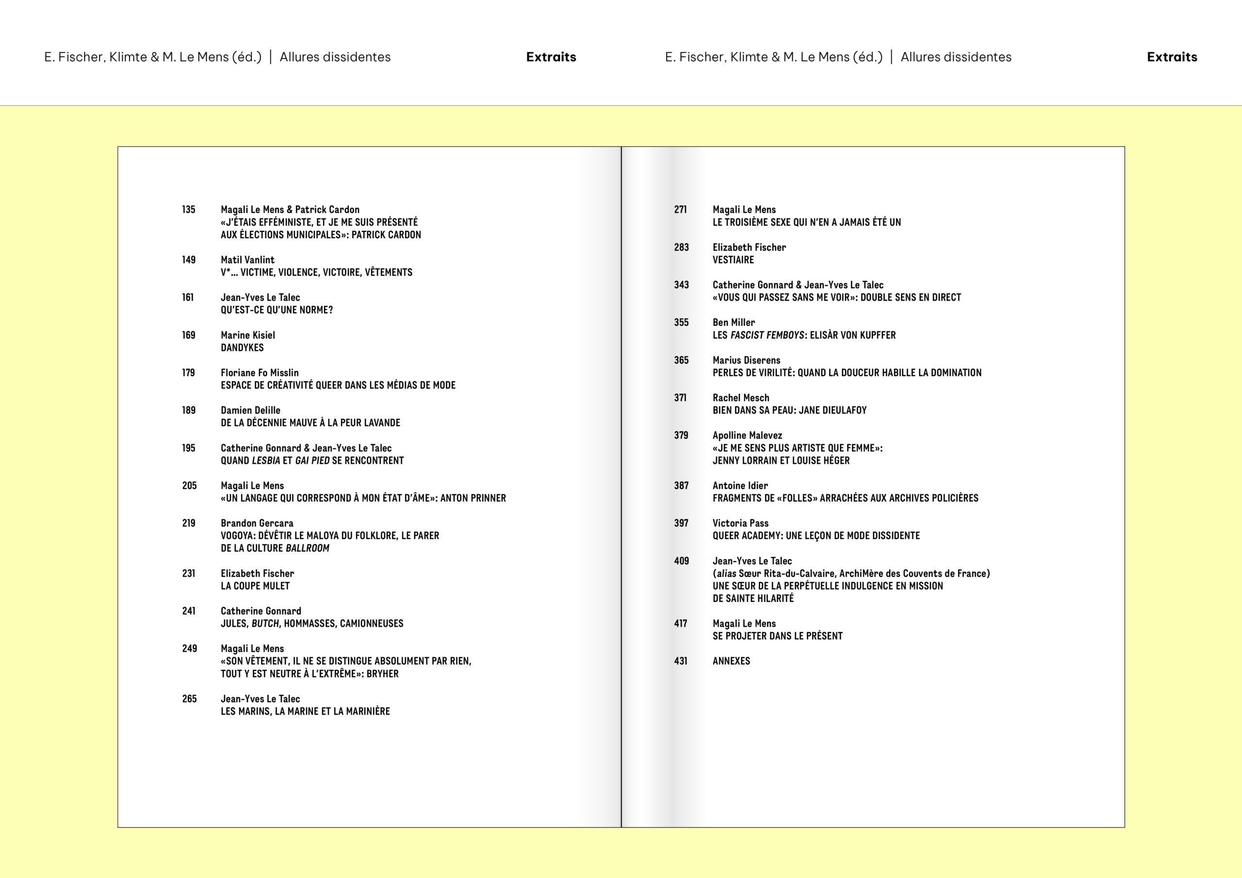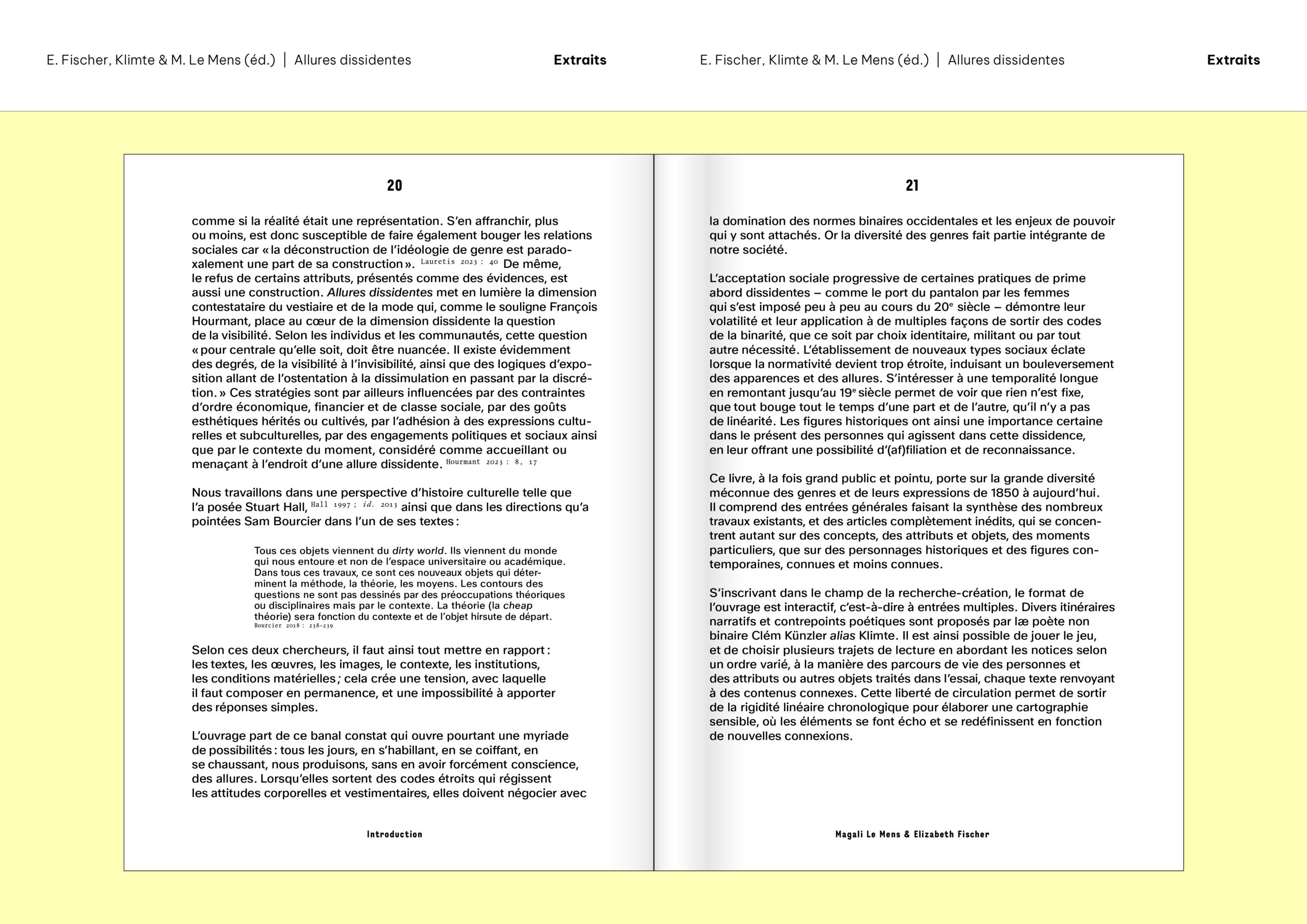 Allures dissidentes retrace l’histoire culturelle et matérielle des apparences du 19e siècle à aujourd’hui. Tous les jours, en nous habillant, en nous coiffant, en nous chaussant, nous créons, sans en avoir forcément conscience, des allures. Le livre aborde les stratégies historiques et actuelles de personnes queer ou non, qui sortent des codes dominants et négocient avec les normes binaires occidentales. Portant son attention sur la Suisse, la Belgique, le Canada, la France métropolitaine, la Guadeloupe et la Réunion, cet ouvrage propose des articles de référence, en français, pour élargir un champ d’études encore dominé par les ressources anglophones. Ce livre n’est pas une encyclopédie qui enferme et fige les définitions, mais un patchwork de récits qui invite celleux qui s’intéressent à la mode, au genre et aux cultures queer, à se saisir du contenu et à créer leur propre lecture.