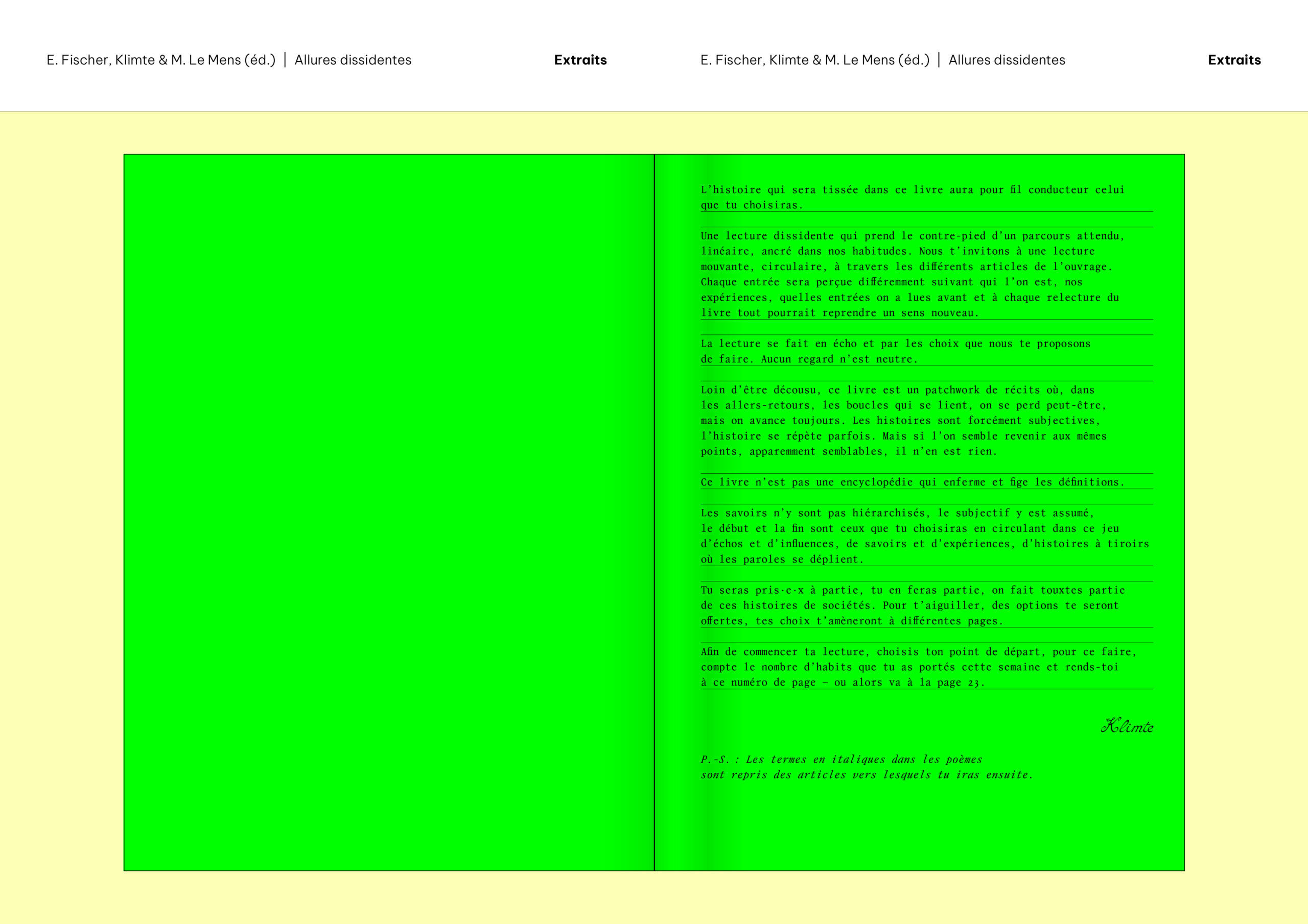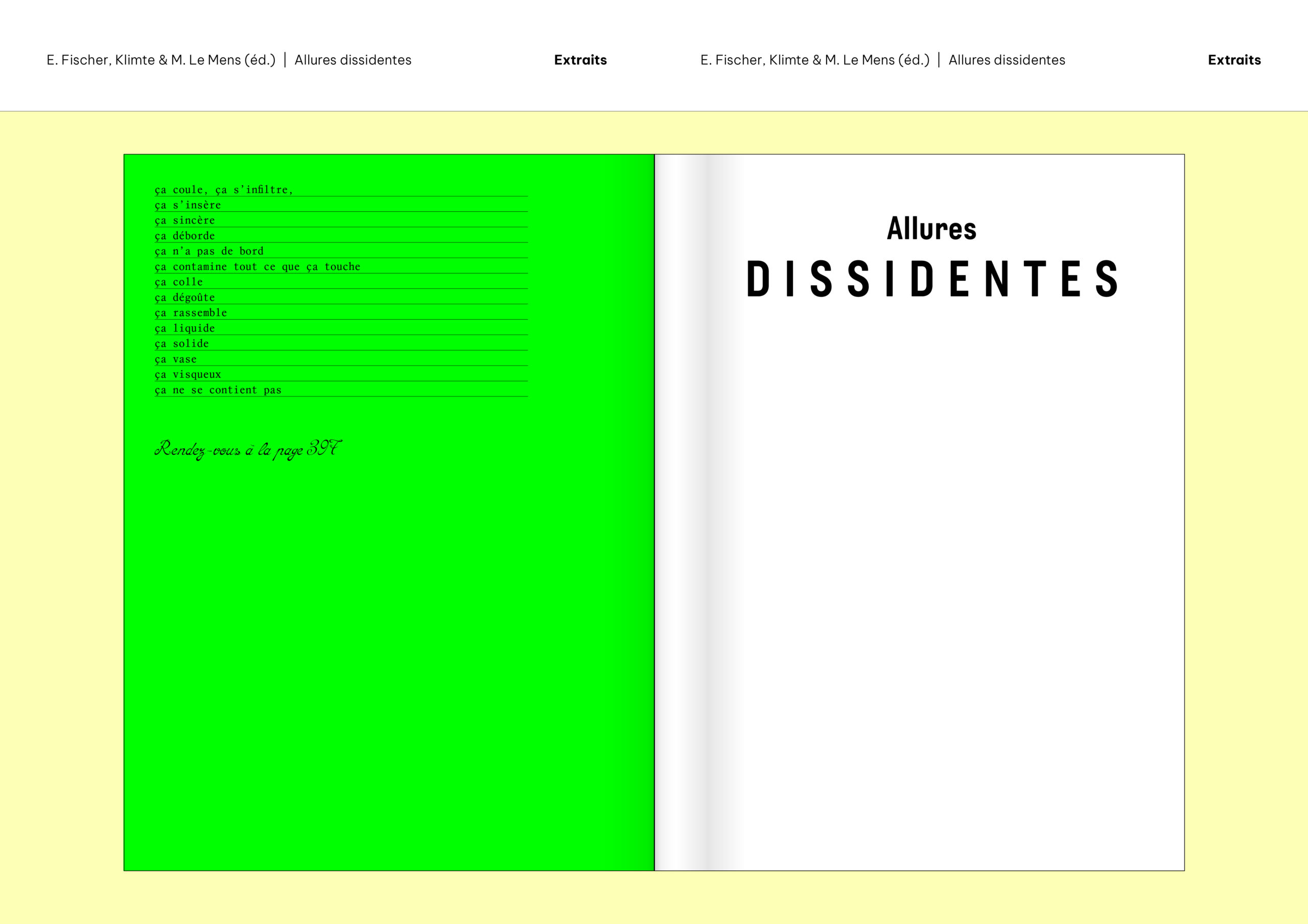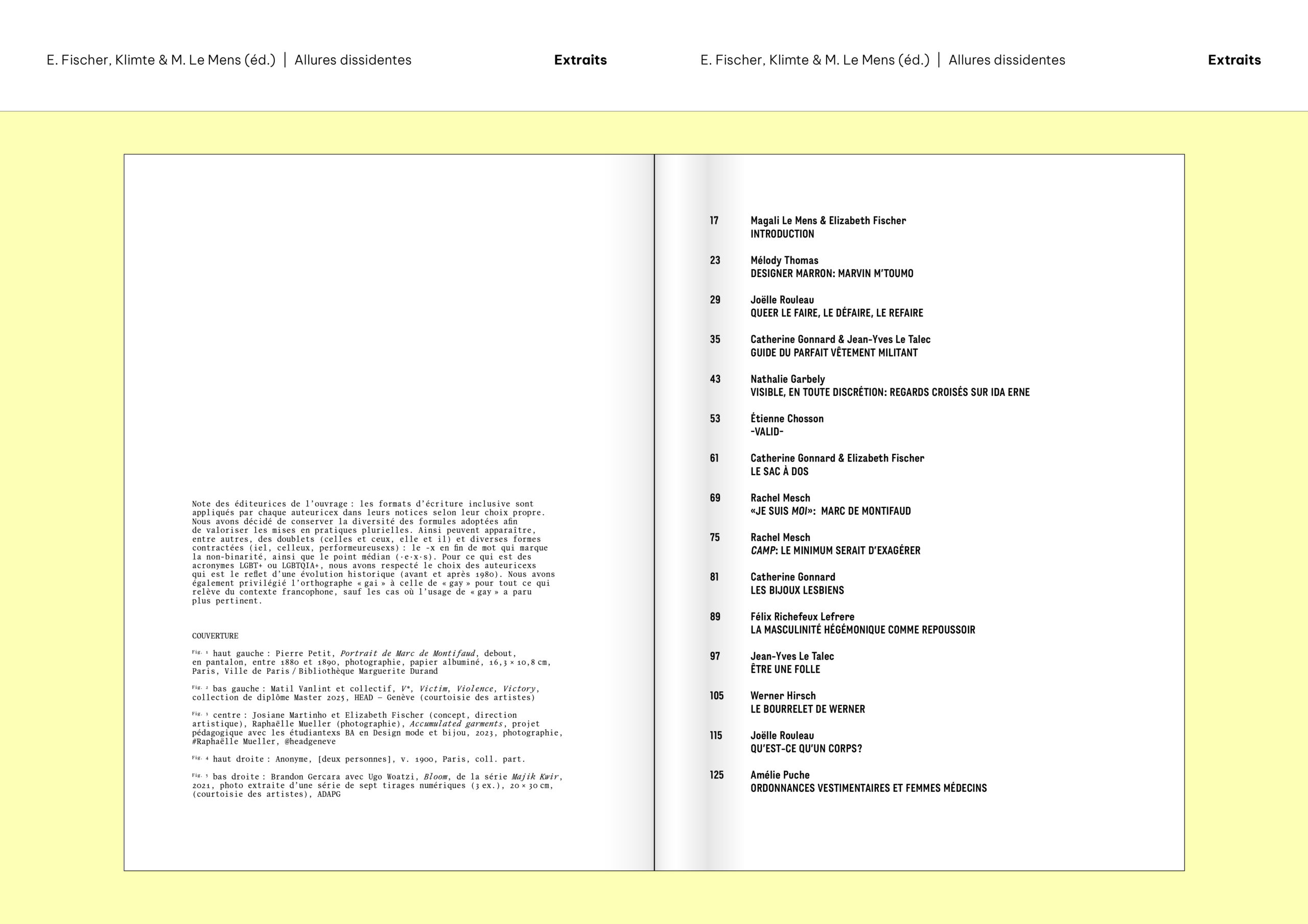 avec les contributions de Caroline Bem, Étienne Chosson, Damien Delille, Marius Diserens, Elizabeth Fischer, Nathalie Garbely, Brandon Gercara, Catherine Gonnard, Werner Hirsch, Antoine Idier, Marine Kisiel, Klimte, Magali Le Mens, Jean-Yves Le Talec, Apolline Malevez, Rachel Mesch, Ben Miller, Floriane Fo Misslin, Victoria Pass, Amélie Puche, Félix Richefeux Lefrere, Joëlle Rouleau, Mélody Thomas, Matil Vanlint