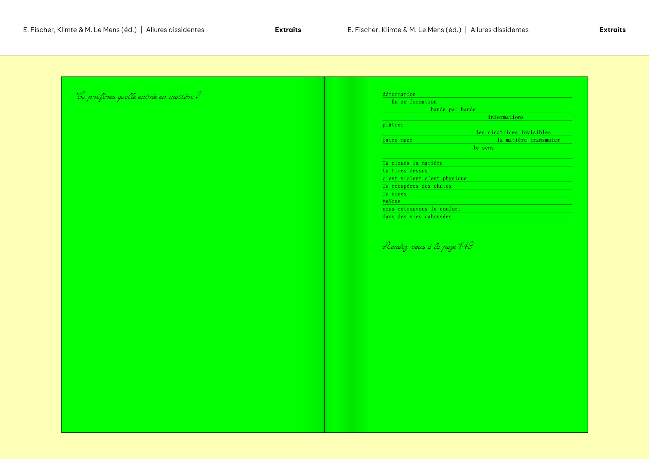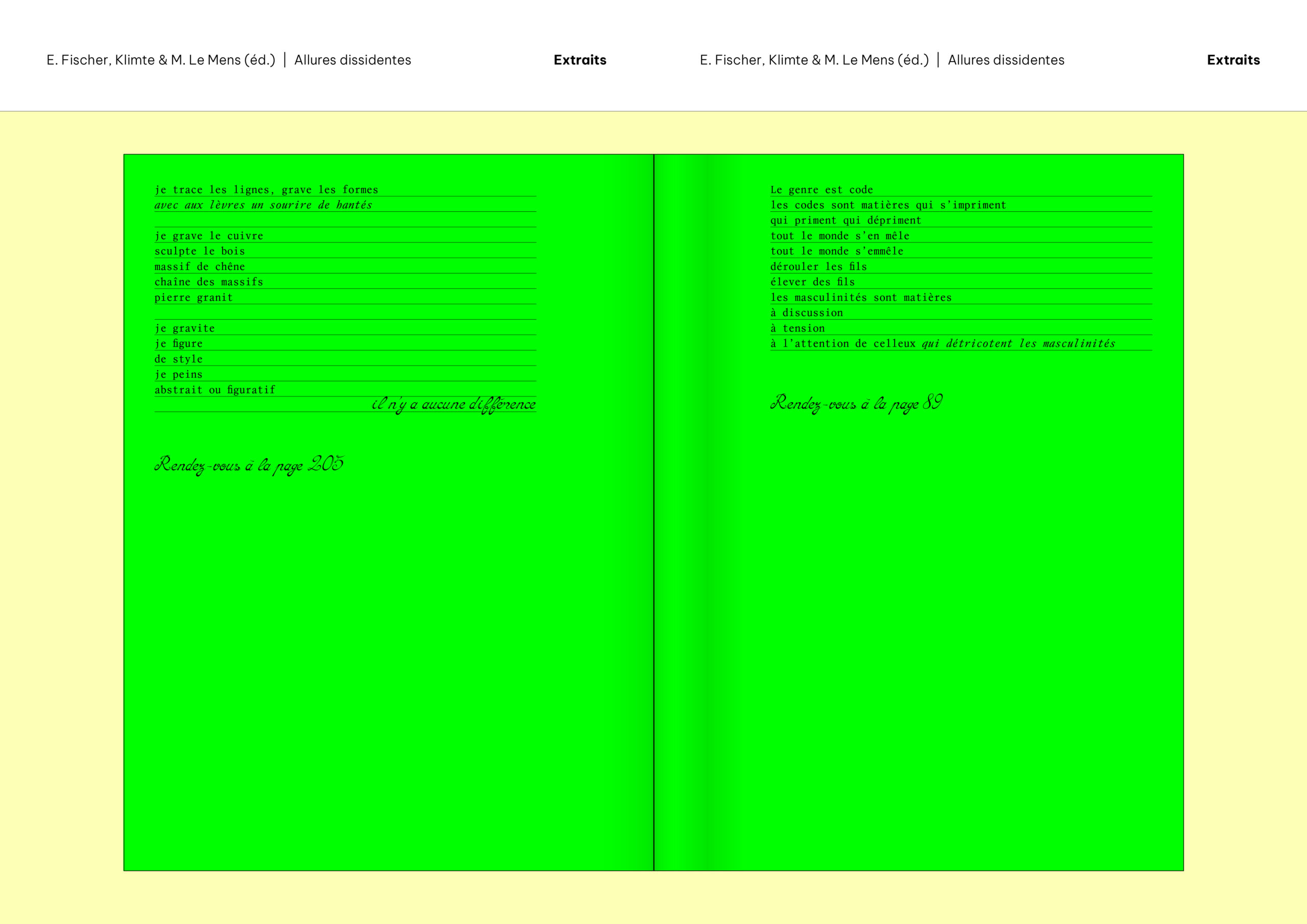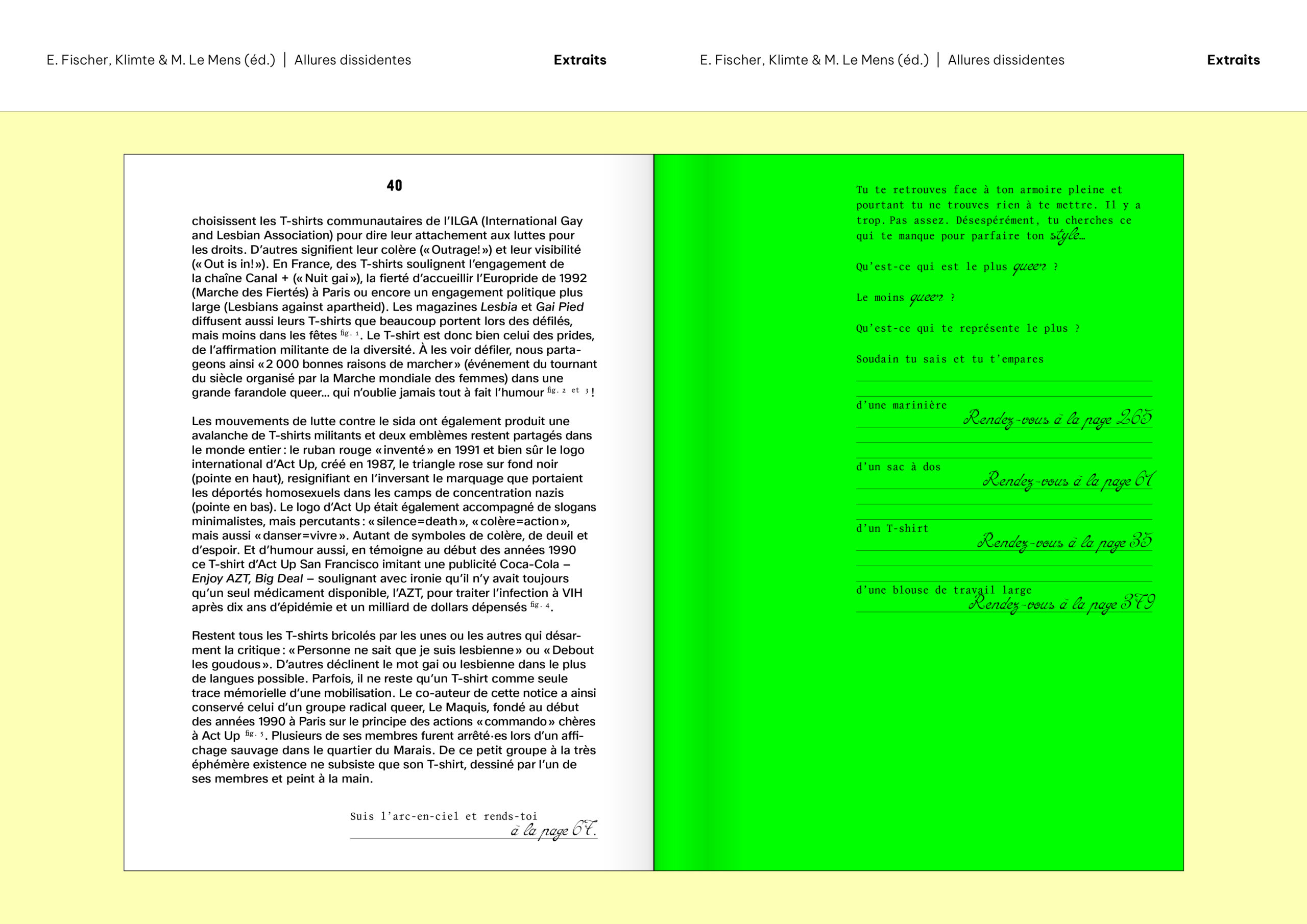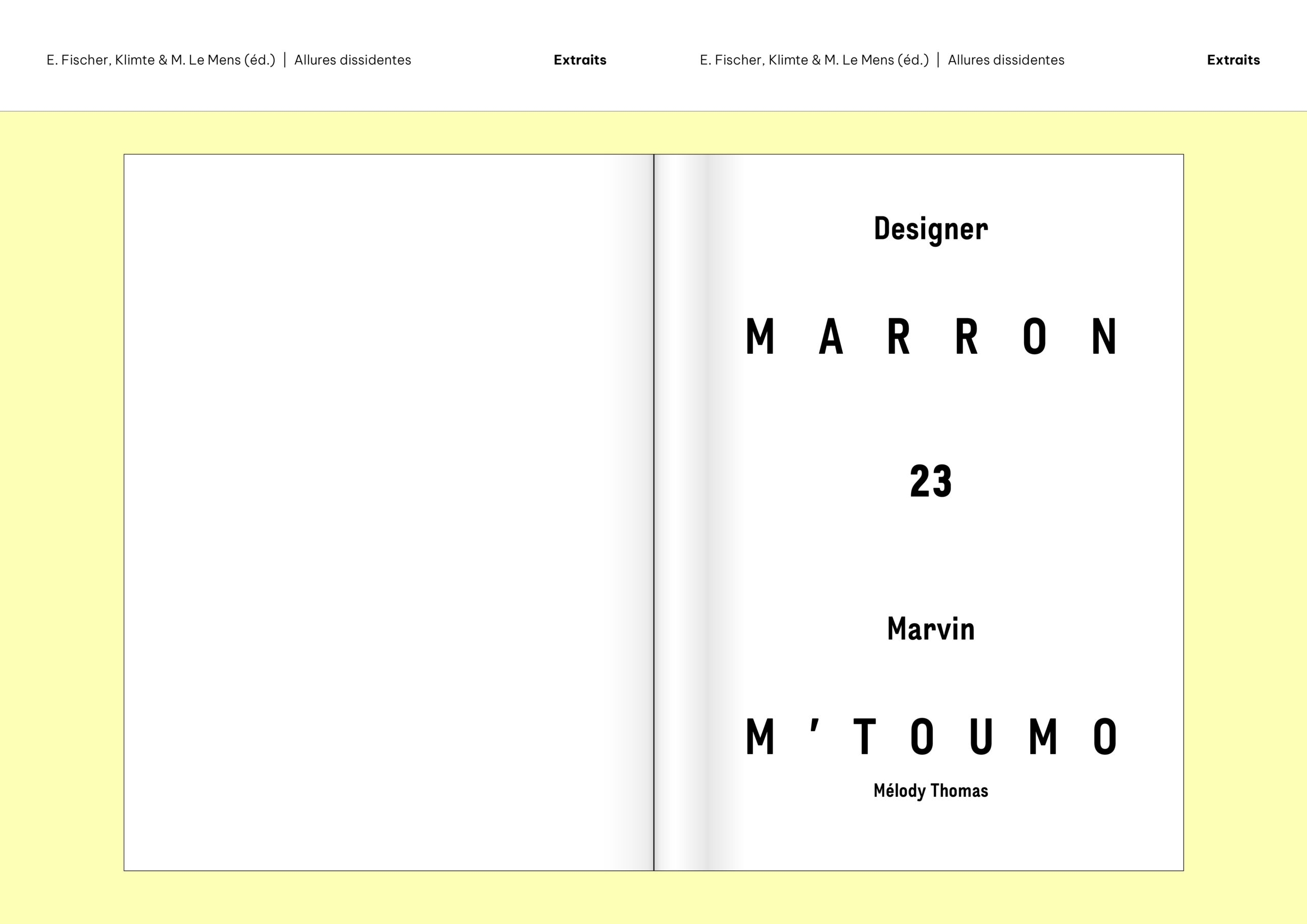 avec les contributions de Caroline Bem, Étienne Chosson, Damien Delille, Marius Diserens, Elizabeth Fischer, Nathalie Garbely, Brandon Gercara, Catherine Gonnard, Werner Hirsch, Antoine Idier, Marine Kisiel, Klimte, Magali Le Mens, Jean-Yves Le Talec, Apolline Malevez, Rachel Mesch, Ben Miller, Floriane Fo Misslin, Victoria Pass, Amélie Puche, Félix Richefeux Lefrere, Joëlle Rouleau, Mélody Thomas, Matil Vanlint