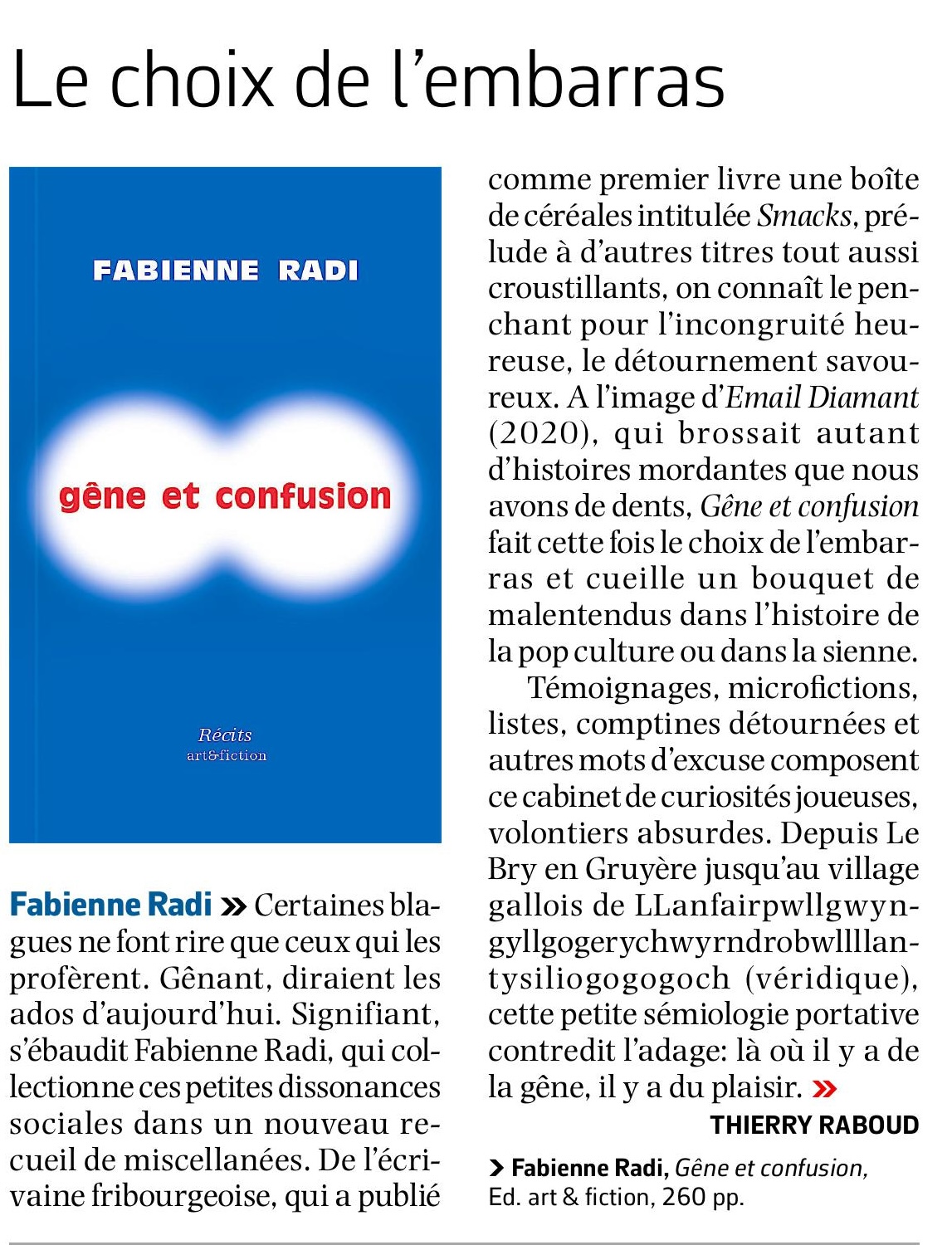 «Fabienne Radi joue avec les mots au pays de la Gêne et confusion» par Étienne Dumont