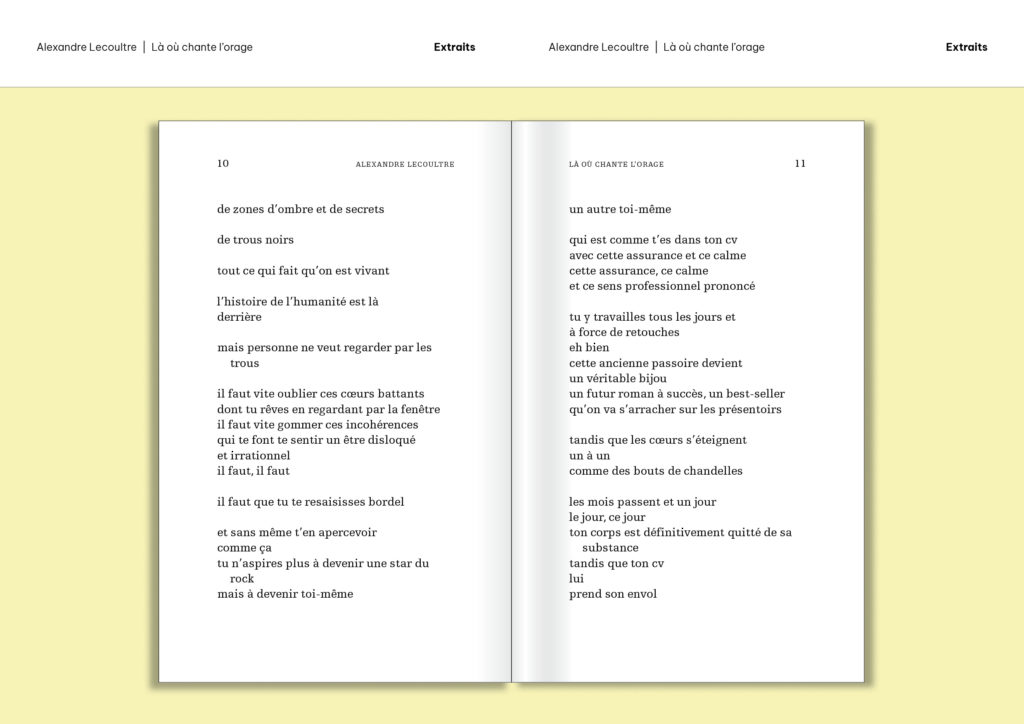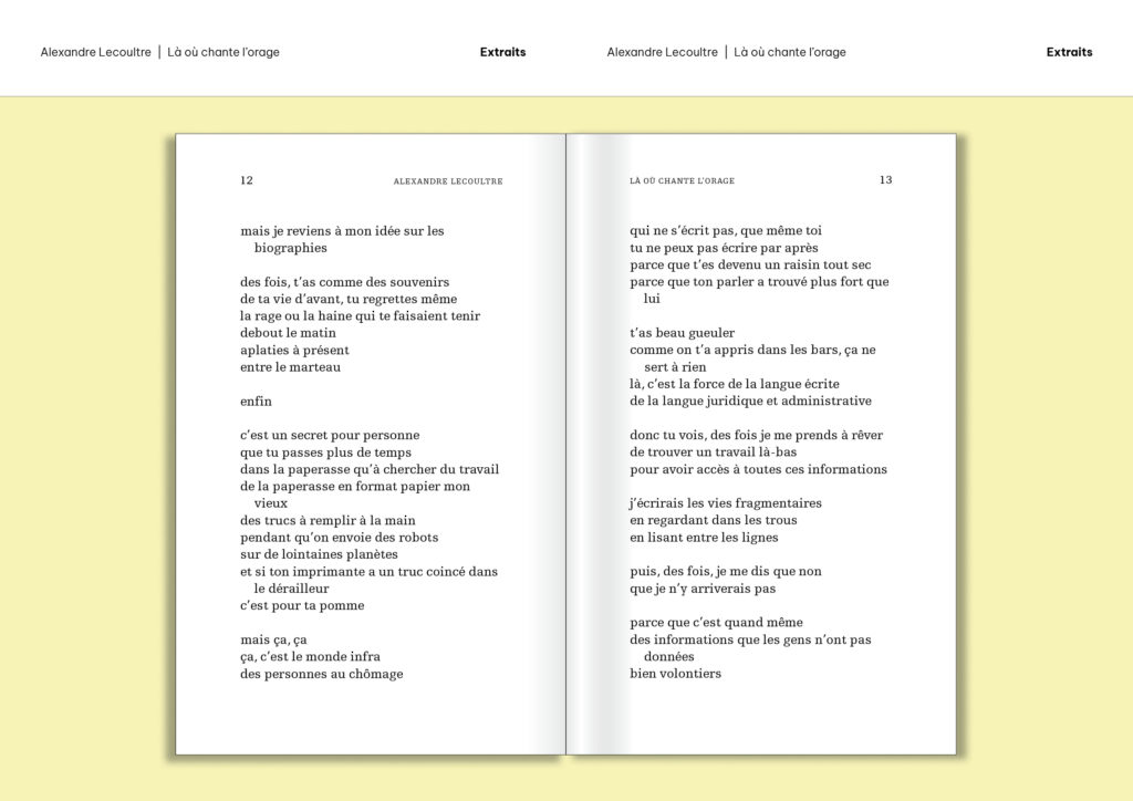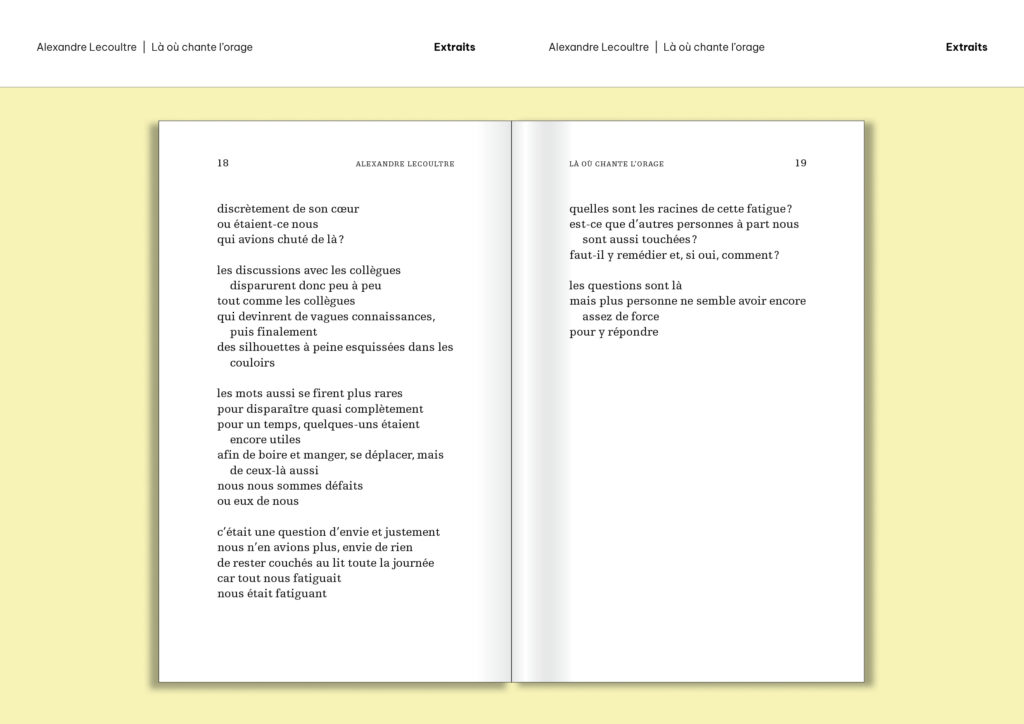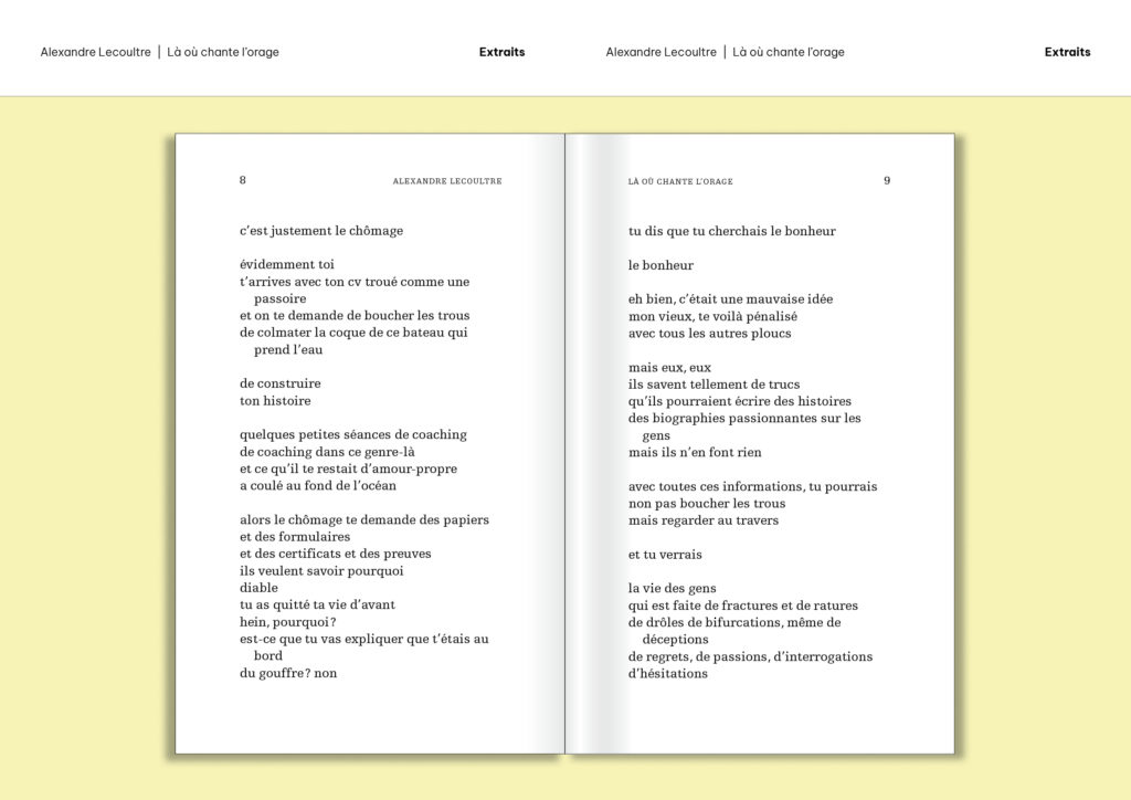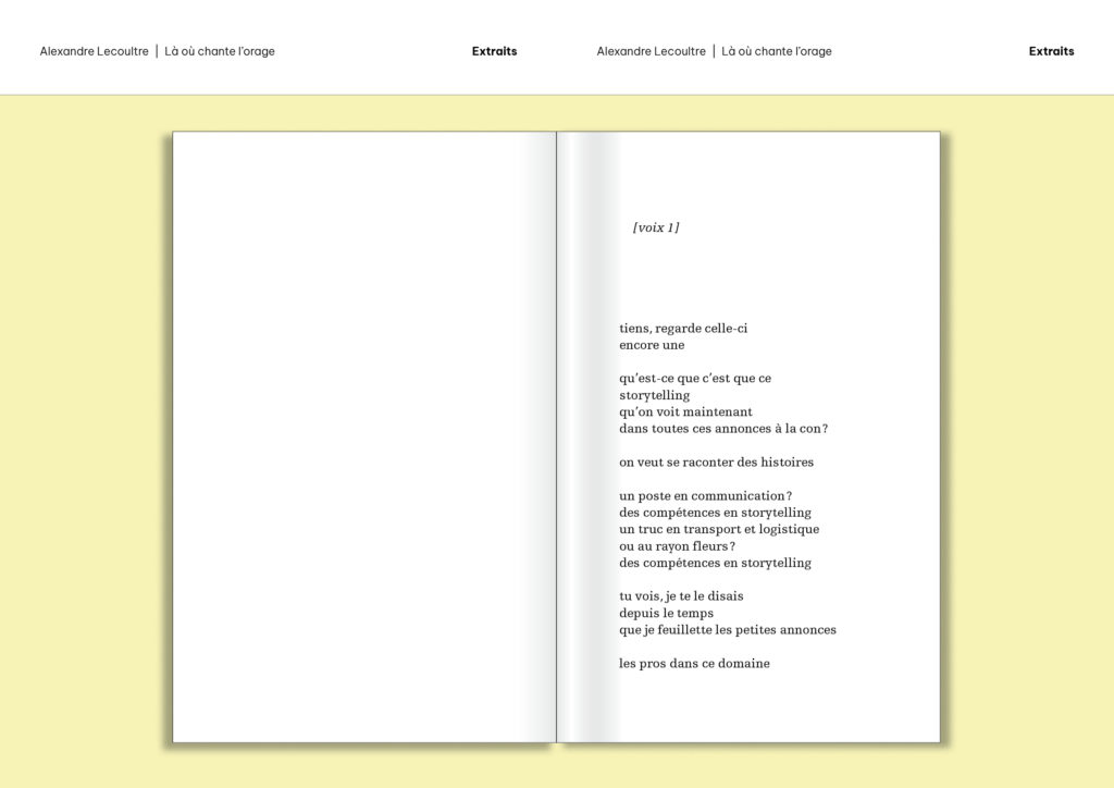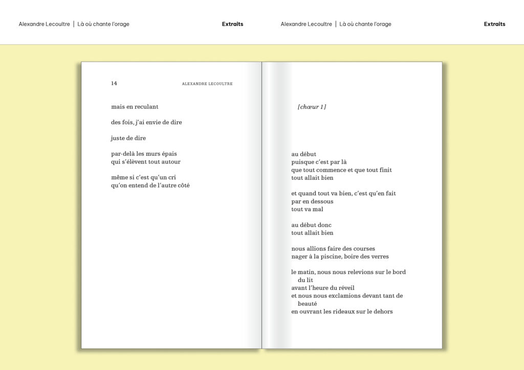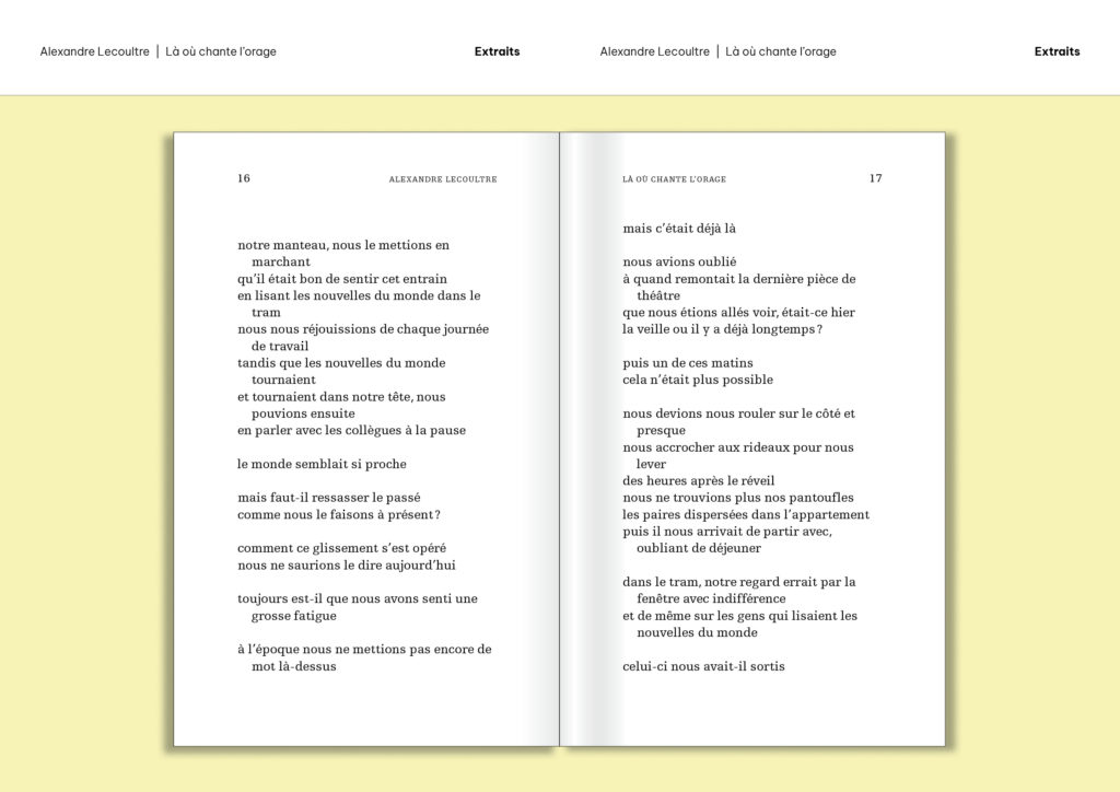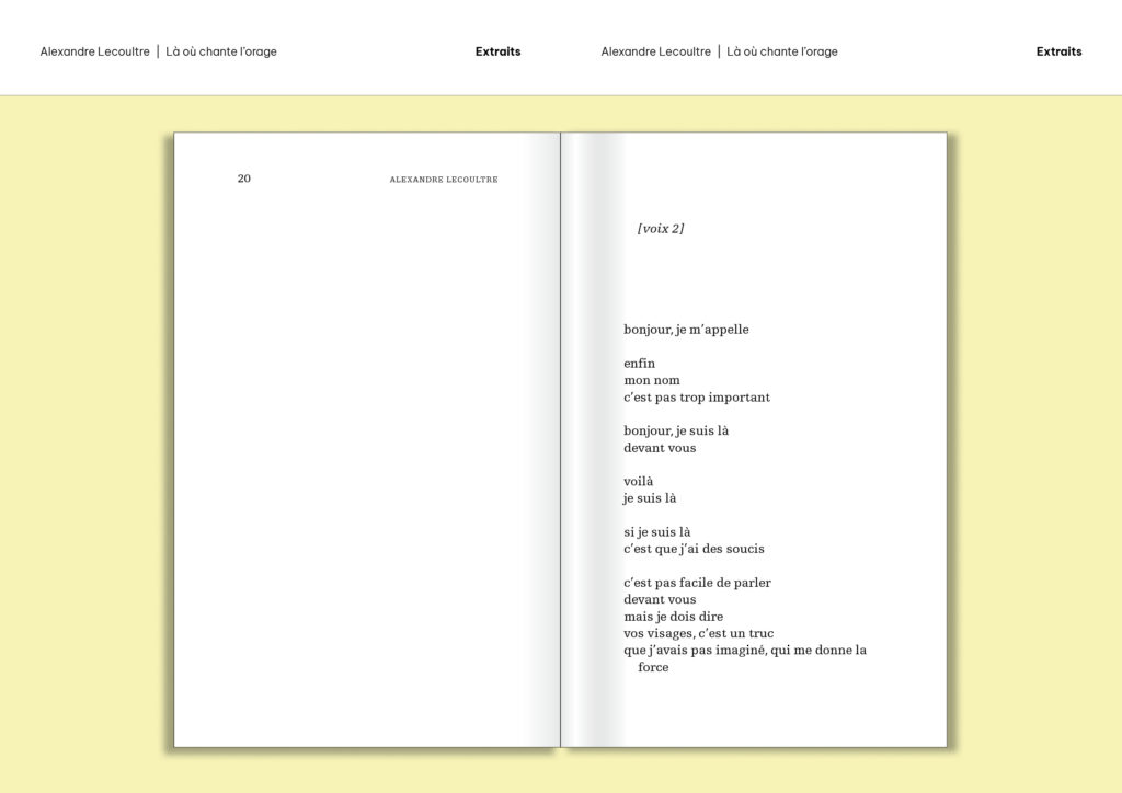 Des personnes ordinaires, prisonnières du quotidien, abasourdies par l’incessante agitation du monde. Au cœur de ces vies qui semblent frappées de silence, des voix pourtant se fraient un chemin. Elles racontent la puissance des rêves, la brutalité du monde du travail, le deuil, des voix au téléphone qui n’appartiennent à personne. Une parole se libère, puissante et vulnérable à la fois. Dans les treize «chants» qui forment le recueil de Là où chante l’orage, Alexandre Lecoultre fait alterner les «voix» anonymes et le «chœur». Comme dans la tragédie antique, les solistes nous parlent de la condition humaine: ils en sont un exemple et une incarnation. Mais le sotto voce ne recouvre pas toujours le sforzando. Les impératifs de nos vies et l’absurdité de l’existence s’égrènent sur le tempo saccadé de courtes phrases, enchaînant questions, doutes, regards. Dans ce récit choral, chaque monologue est une catharsis. Il reste encore ces petites choses qui font la beauté du monde: le bruit des pas dans la neige, la lumière des étoiles dans la forêt, la chaleur d’une présence bienveillante.