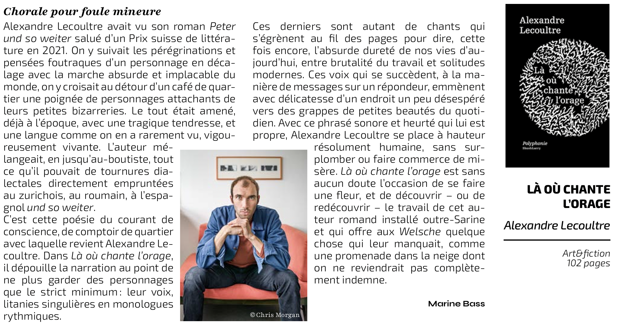 Des personnes ordinaires, prisonnières du quotidien, abasourdies par l’incessante agitation du monde. Au cœur de ces vies qui semblent frappées de silence, des voix pourtant se fraient un chemin. Elles racontent la puissance des rêves, la brutalité du monde du travail, le deuil, des voix au téléphone qui n’appartiennent à personne. Une parole se libère, puissante et vulnérable à la fois. Dans les treize «chants» qui forment le recueil de Là où chante l’orage, Alexandre Lecoultre fait alterner les «voix» anonymes et le «chœur». Comme dans la tragédie antique, les solistes nous parlent de la condition humaine: ils en sont un exemple et une incarnation. Mais le sotto voce ne recouvre pas toujours le sforzando. Les impératifs de nos vies et l’absurdité de l’existence s’égrènent sur le tempo saccadé de courtes phrases, enchaînant questions, doutes, regards. Dans ce récit choral, chaque monologue est une catharsis. Il reste encore ces petites choses qui font la beauté du monde: le bruit des pas dans la neige, la lumière des étoiles dans la forêt, la chaleur d’une présence bienveillante.