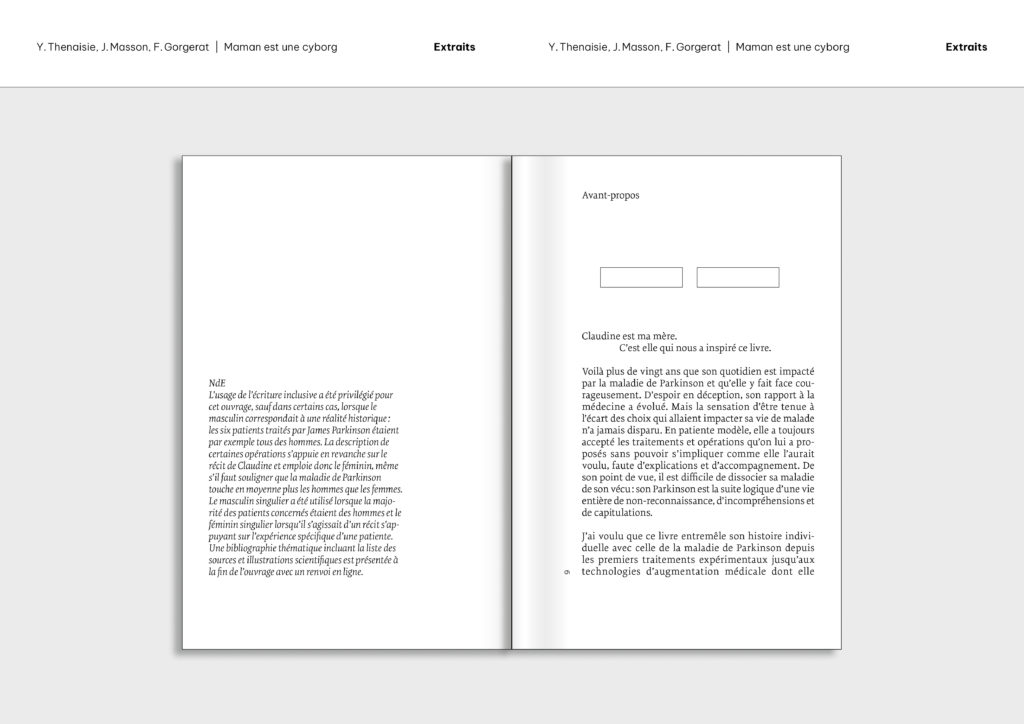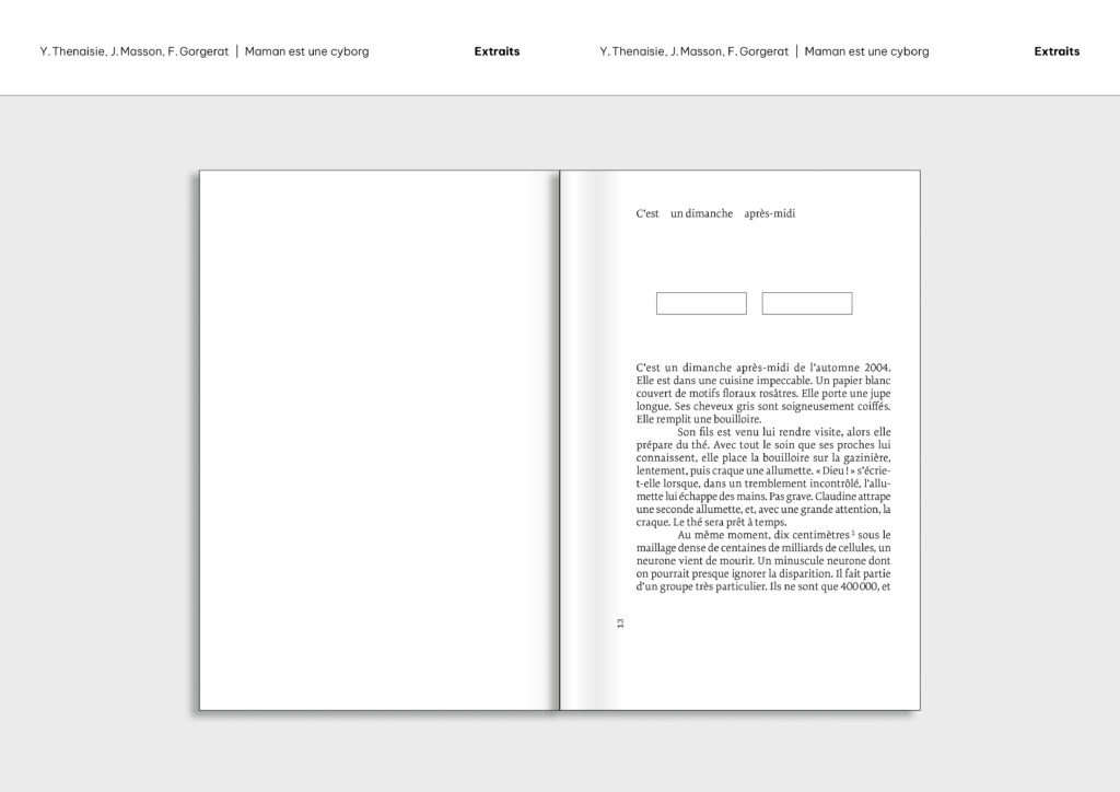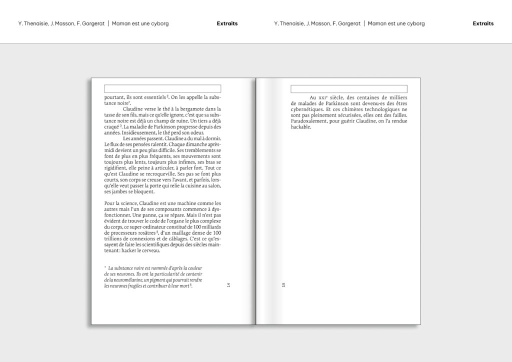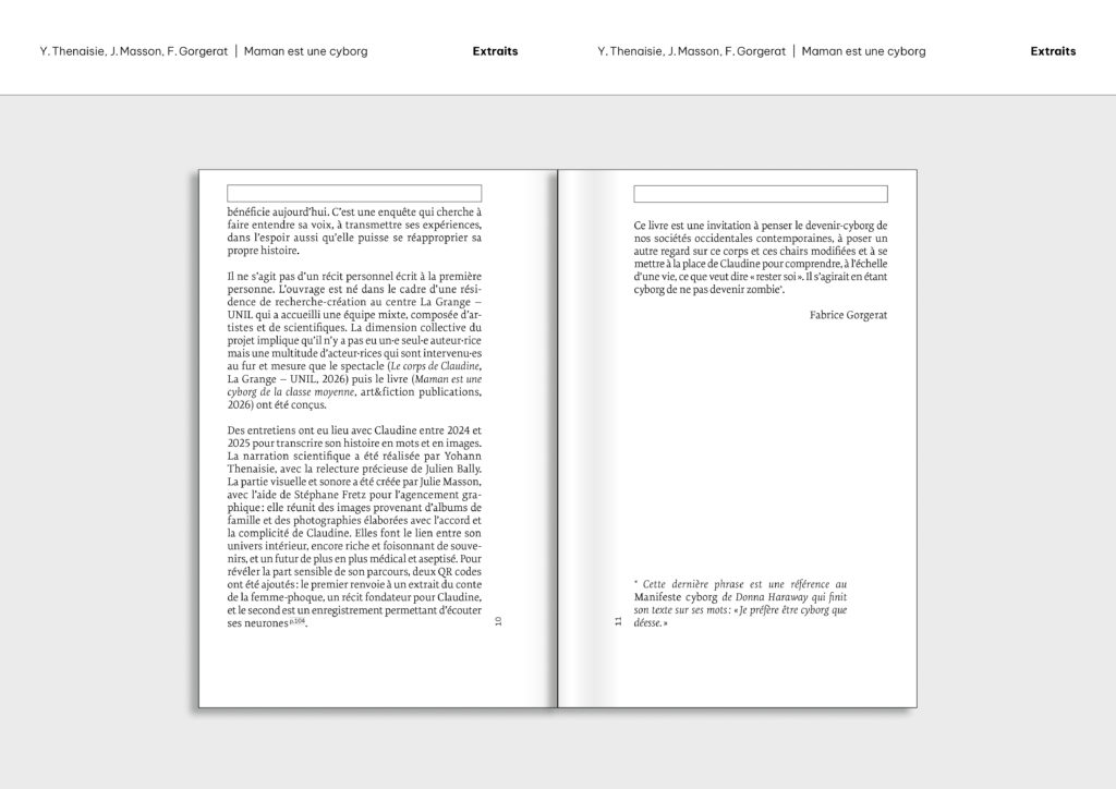Claudine est la mère du dramaturge Fabrice Gorgerat. Son récit a été transposé dans une narration scientifique par le chercheur Yohann Thenaisie et son corps a été photographié par Julie Masson. Ce livre raconte la condition de Claudine, et à travers elle, l’histoire de la maladie de Parkinson. Sa grande histoire faite d’expérimentations médicales, de drogues de synthèse, de camps militaires américains et de champs de pesticides. Mais aussi l’histoire ordinaire d’une patiente parmi d’autres, de la zone pavillonnaire où elle vit, de son combat contre la maladie, de la technologie parfois dysfonctionnelle dans sa chair, de sa quête d’un sens supérieur à la déflagration de son corps.