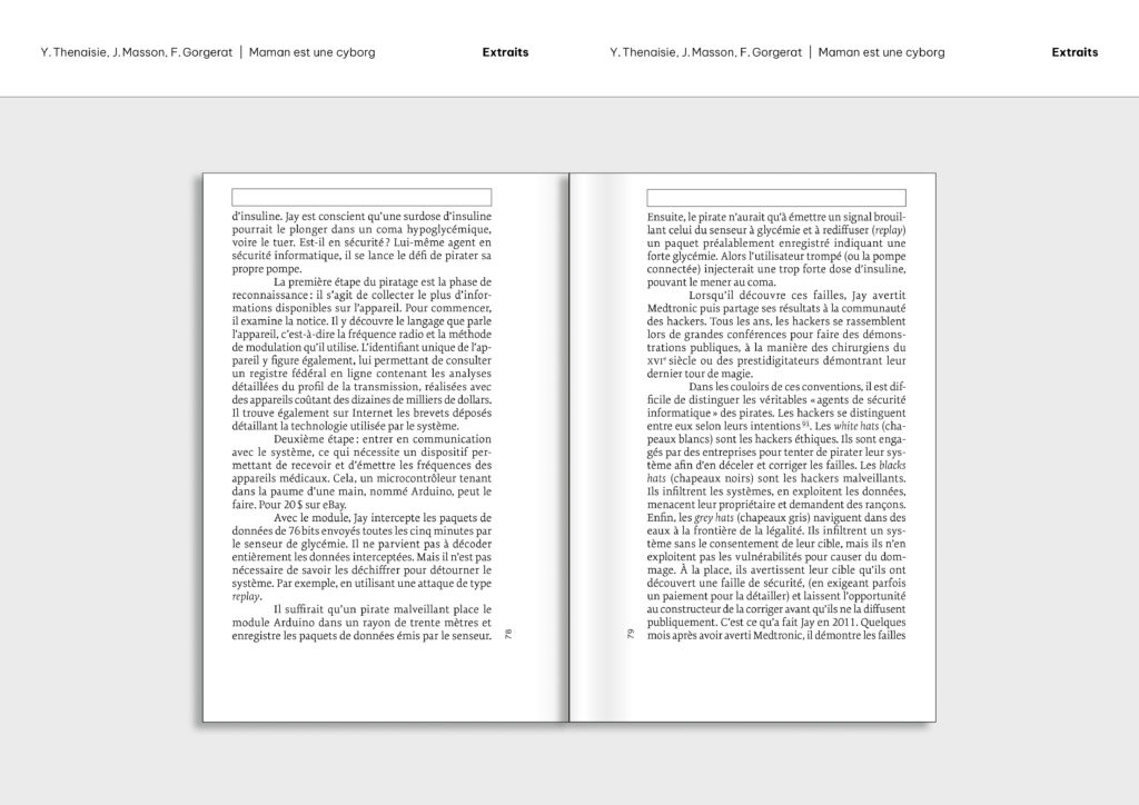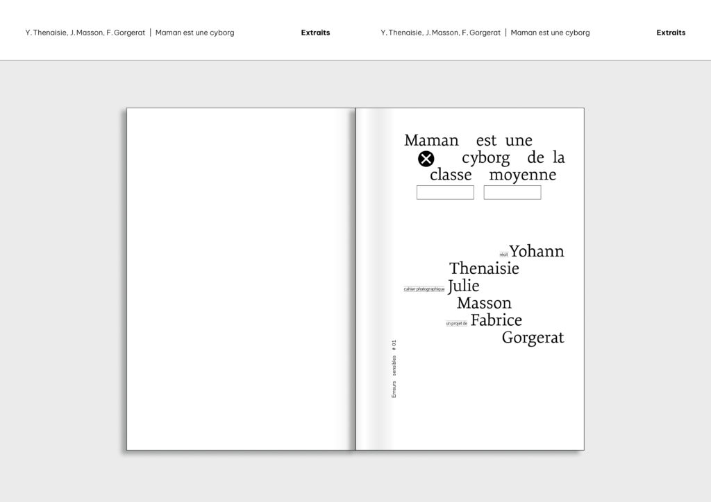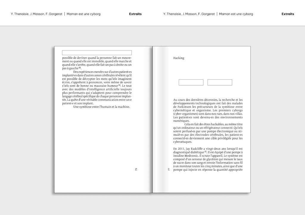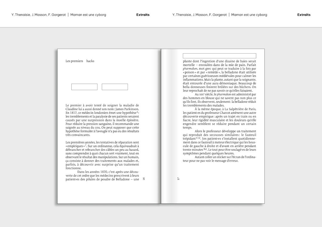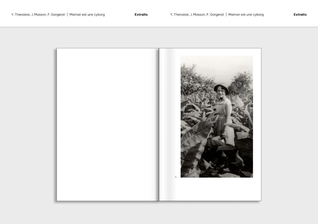 Claudine est la mère du dramaturge Fabrice Gorgerat. Son récit a été transposé dans une narration scientifique par le chercheur Yohann Thenaisie et son corps a été photographié par Julie Masson. Ce livre raconte la condition de Claudine, et à travers elle, l’histoire de la maladie de Parkinson. Sa grande histoire faite d’expérimentations médicales, de drogues de synthèse, de camps militaires américains et de champs de pesticides. Mais aussi l’histoire ordinaire d’une patiente parmi d’autres, de la zone pavillonnaire où elle vit, de son combat contre la maladie, de la technologie parfois dysfonctionnelle dans sa chair, de sa quête d’un sens supérieur à la déflagration de son corps.