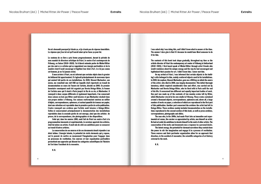 Curateur proche des artistes, Michel Ritter (1949-2007) a été le directeur du Centre Culturel Suisse de Paris (2002-2007) et, avant cela, de la Kunsthalle Friart à Fribourg (1990-2002), le centre d’art à la réputation radicale qu’il a fondé. Il a construit en parallèle de cette carrière de curateur une œuvre poétique d’une cohérence exemplaire. Évoluant en solitaire, n’exposant que peu, l’artiste n’a pourtant cessé de travailler et d’expérimenter. Il a conservé une partie importante de ses œuvres désormais accessibles grâce à cette première monographie, qui fait suite à l’exposition éponyme ayant eu lieu à Friart en 2021.