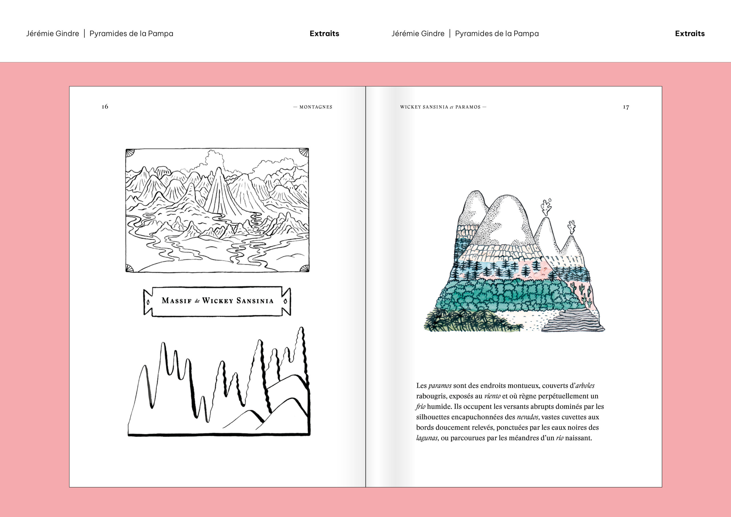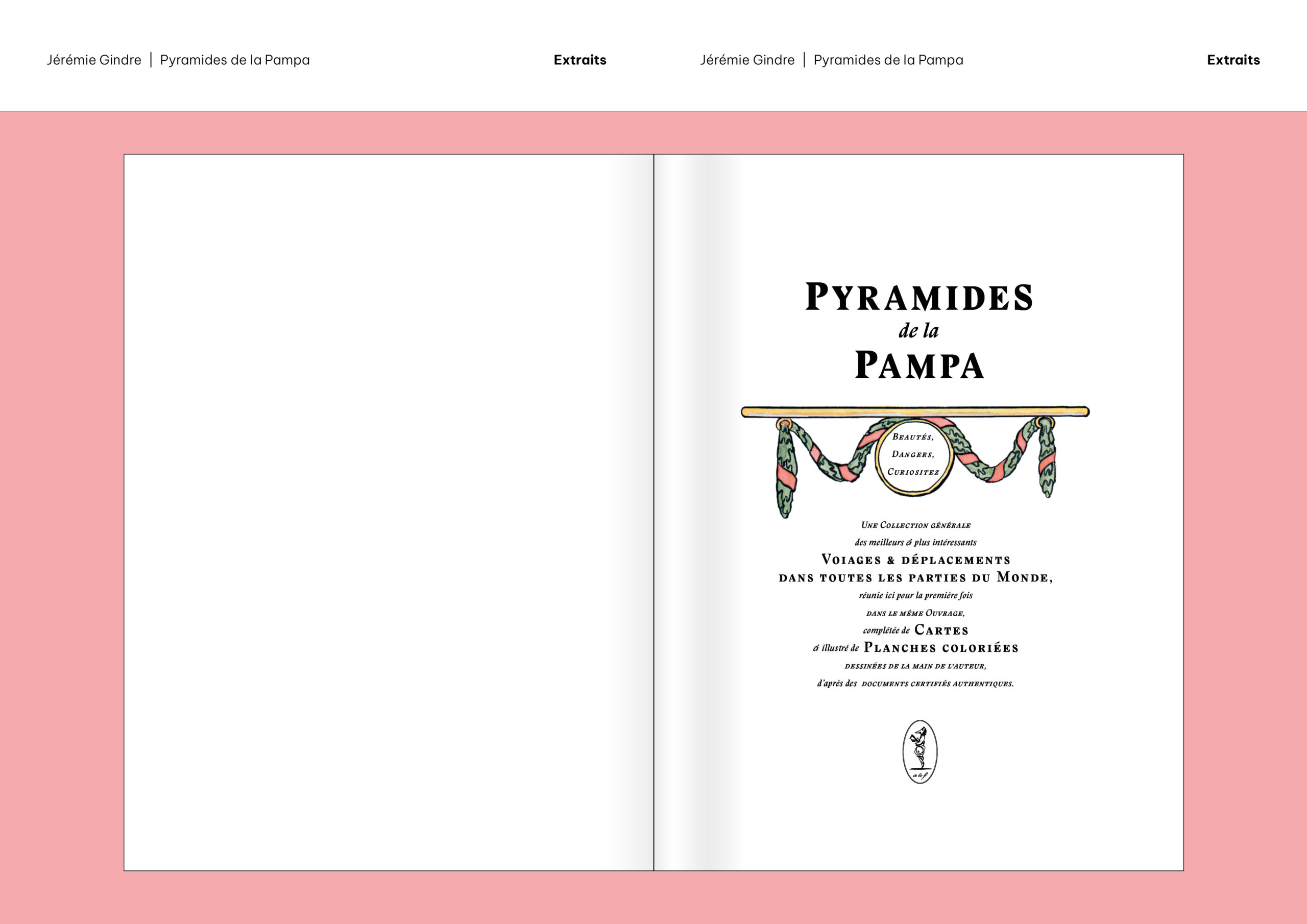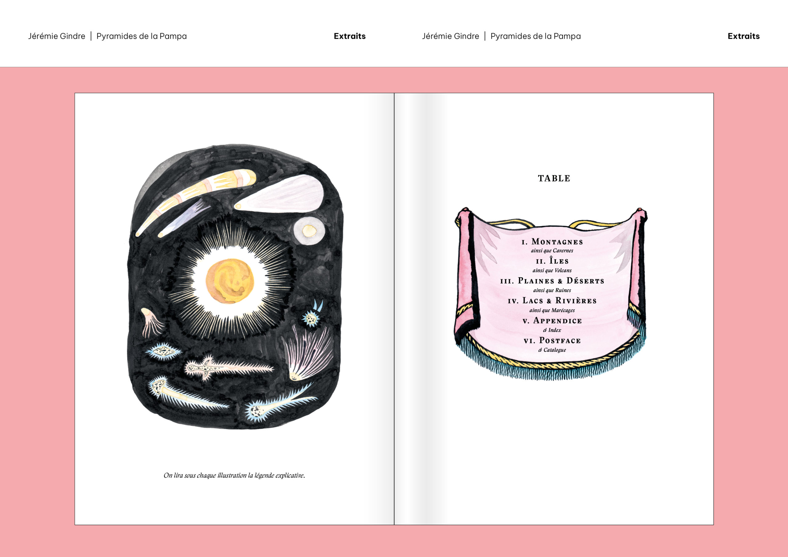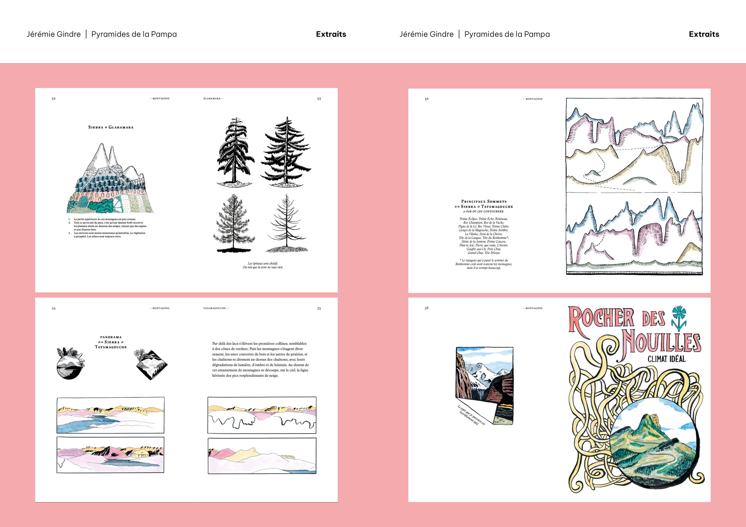 Pyramides de la Pampa est un livre d’images et de textes qui prend la forme d’un atlas. Il a été écrit et dessiné à partir de documents provenant, pour la plupart, des collections de la Bibliothèque de Genève. Ces sources historiques ont été retravaillées pour construire le récit fragmenté d’un monde étranger, ravivant le goût du mystère et de l’inconnu. Sorte de grand voyage en bibliothèque, cet atlas nous guide dans les imaginaires géographiques d’une époque et d’une société, pour mieux en souligner le pouvoir de fiction. Les cartes, schémas, tableaux comparatifs, vignettes et réclames nous présentent des territoires familiers qui paraissent pourtant ici découverts comme au premier jour, dominés par un exotisme à la fois racoleur et inquiétant. Promettant monts et merveilles autant que risques et périls, Atlas touristique des Pyramides de la Pampa (son titre complet) décrit et raconte un monde qui n’a jamais existé, sauf dans les livres.