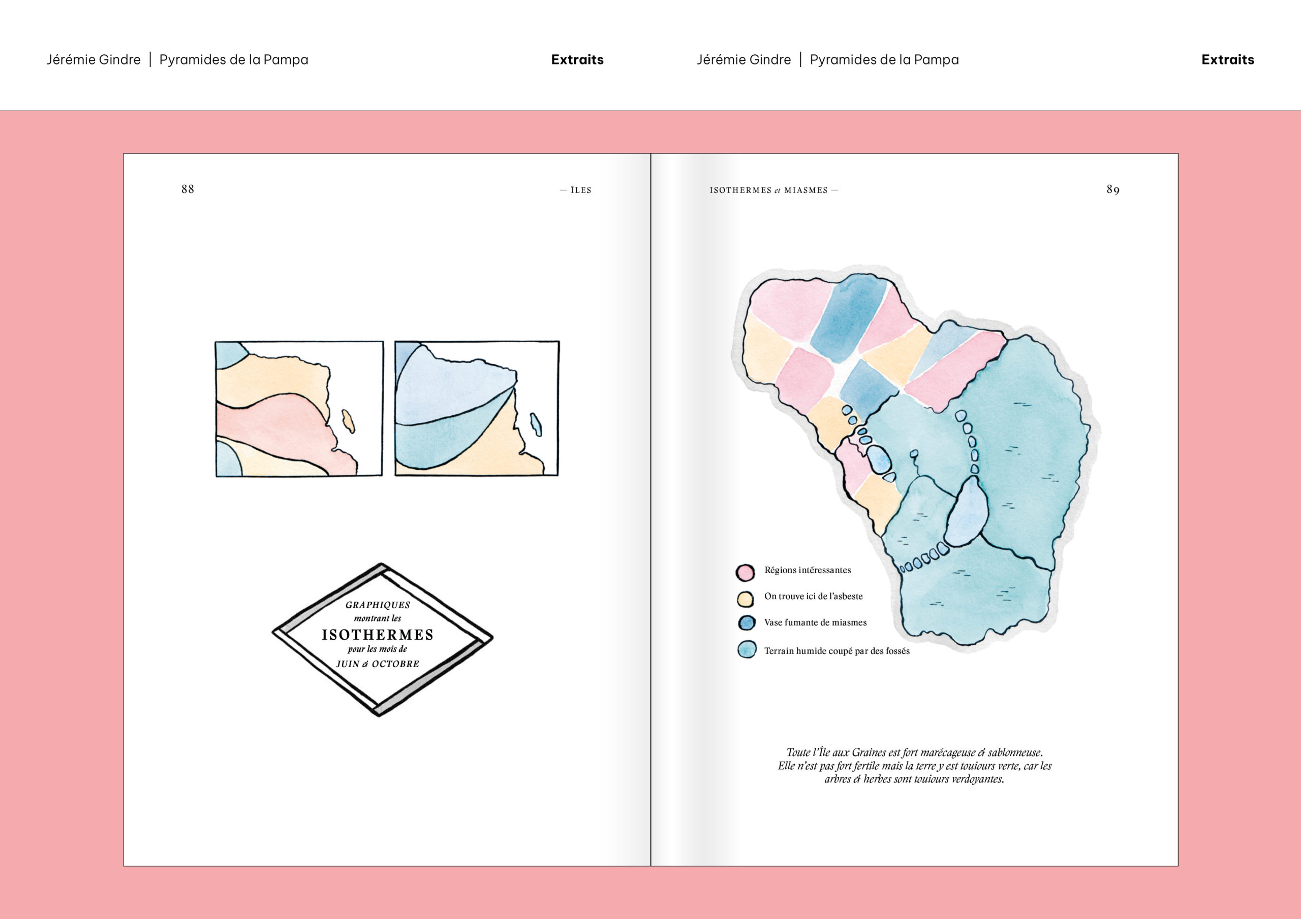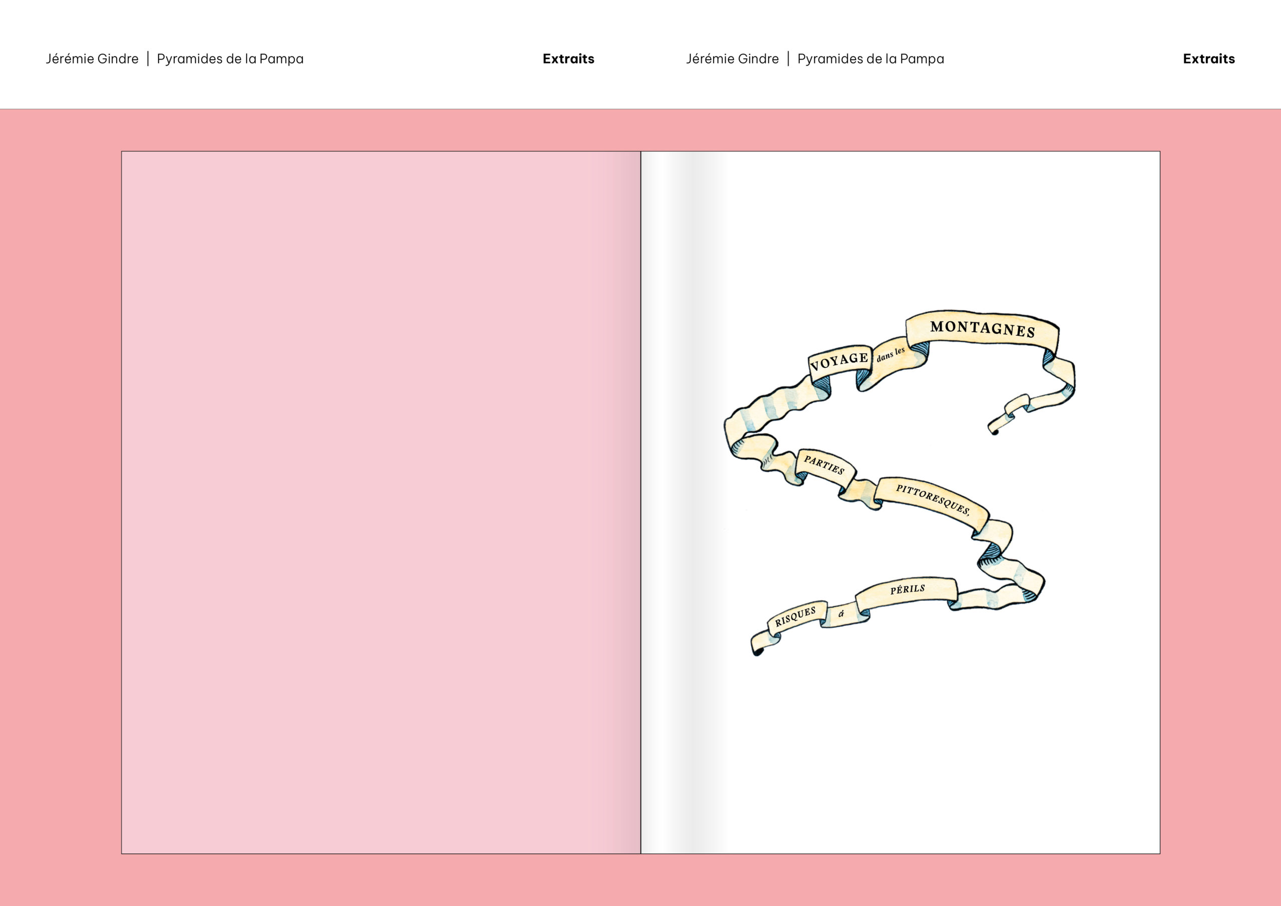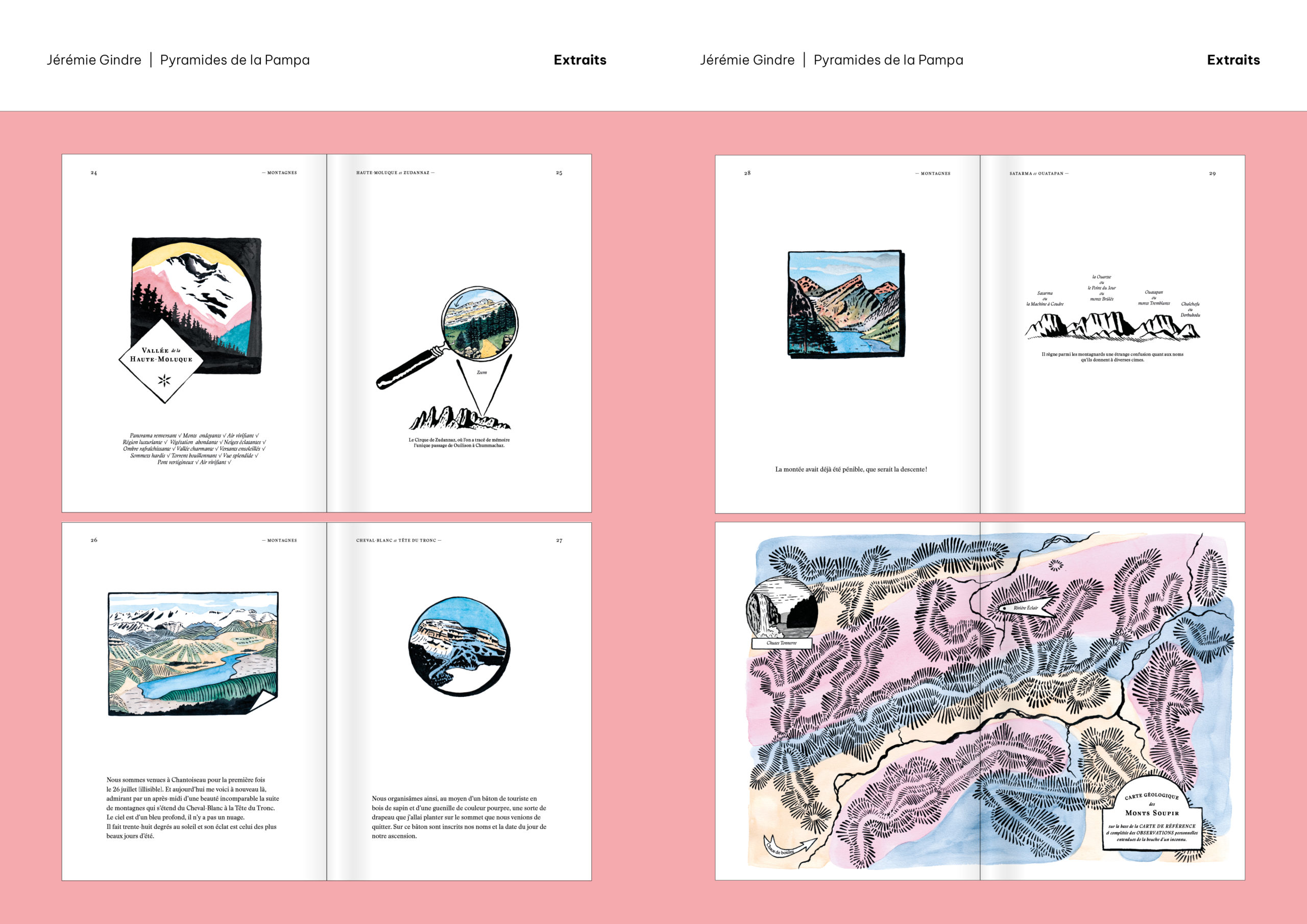 Pyramides de la Pampa est un livre d’images et de textes qui prend la forme d’un atlas. Il a été écrit et dessiné à partir de documents provenant, pour la plupart, des collections de la Bibliothèque de Genève. Ces sources historiques ont été retravaillées pour construire le récit fragmenté d’un monde étranger, ravivant le goût du mystère et de l’inconnu. Sorte de grand voyage en bibliothèque, cet atlas nous guide dans les imaginaires géographiques d’une époque et d’une société, pour mieux en souligner le pouvoir de fiction. Les cartes, schémas, tableaux comparatifs, vignettes et réclames nous présentent des territoires familiers qui paraissent pourtant ici découverts comme au premier jour, dominés par un exotisme à la fois racoleur et inquiétant. Promettant monts et merveilles autant que risques et périls, Atlas touristique des Pyramides de la Pampa (son titre complet) décrit et raconte un monde qui n’a jamais existé, sauf dans les livres.