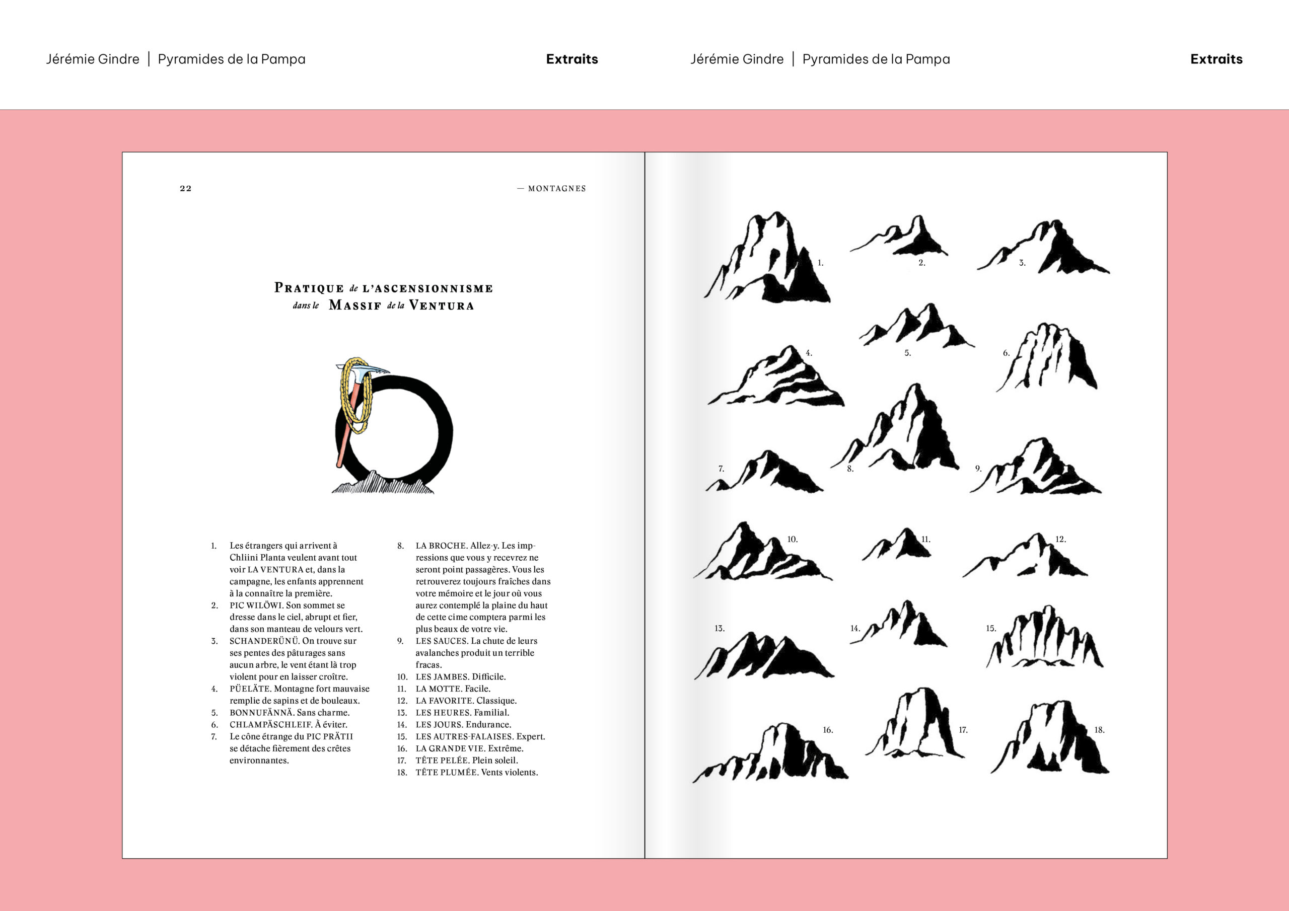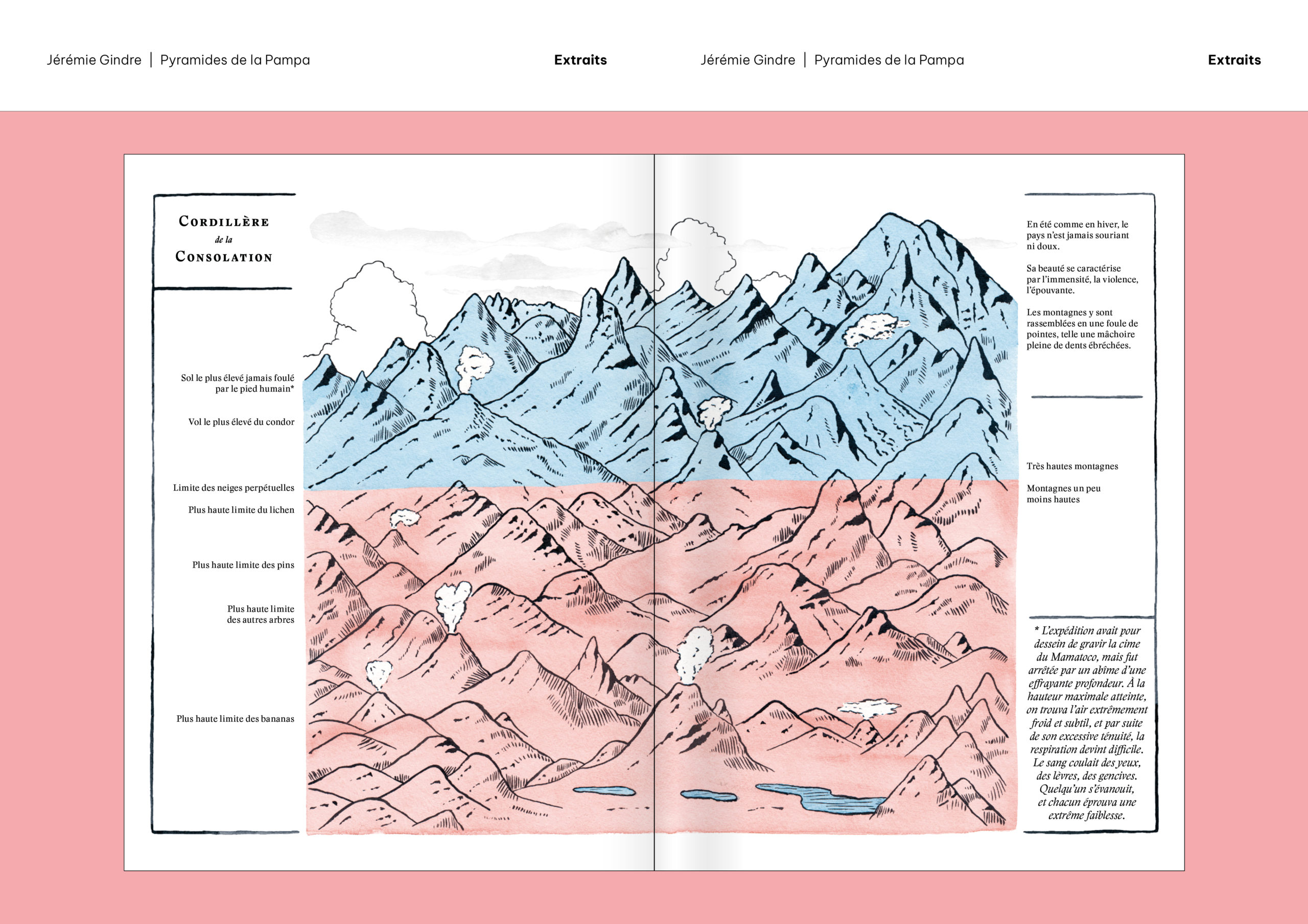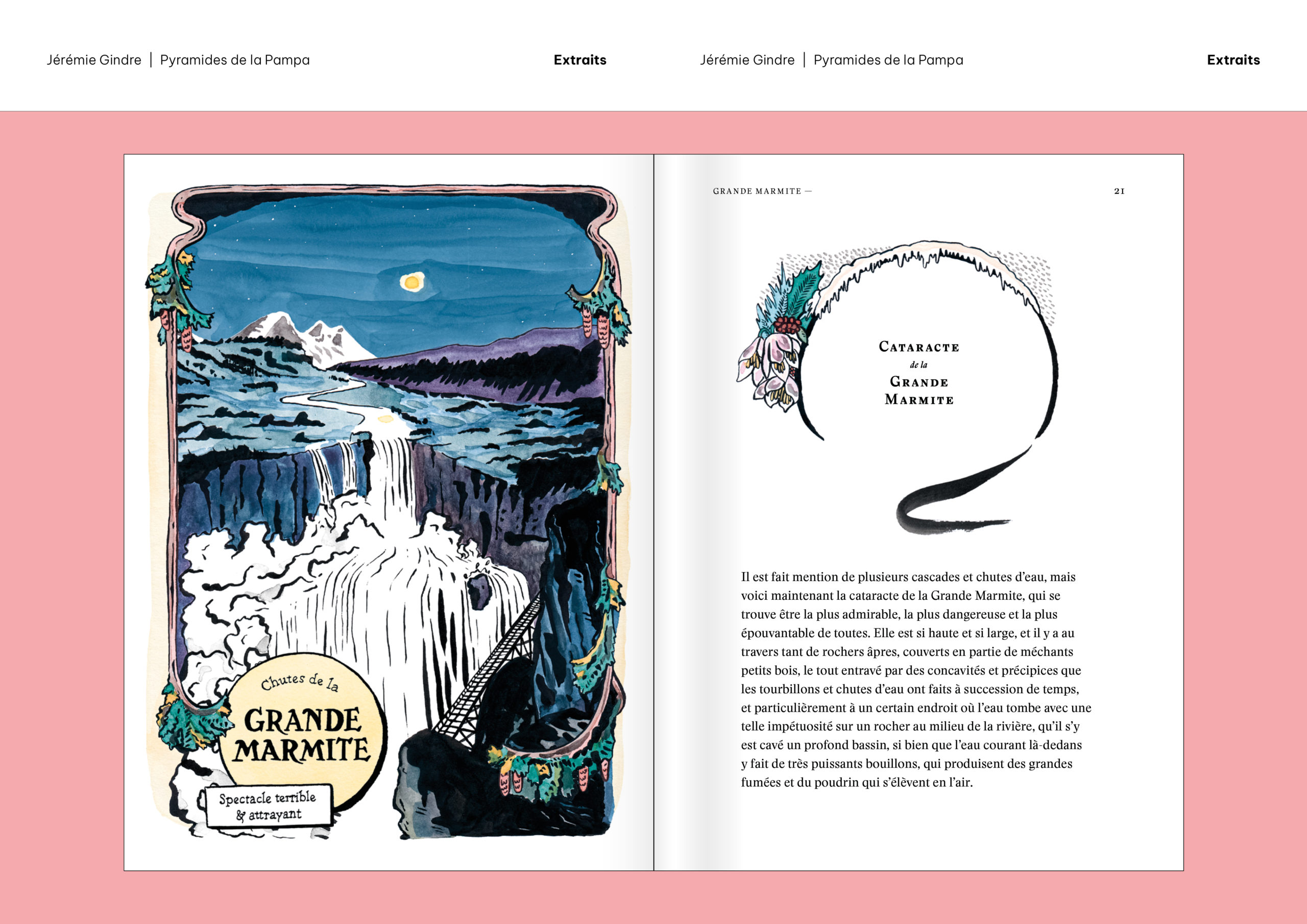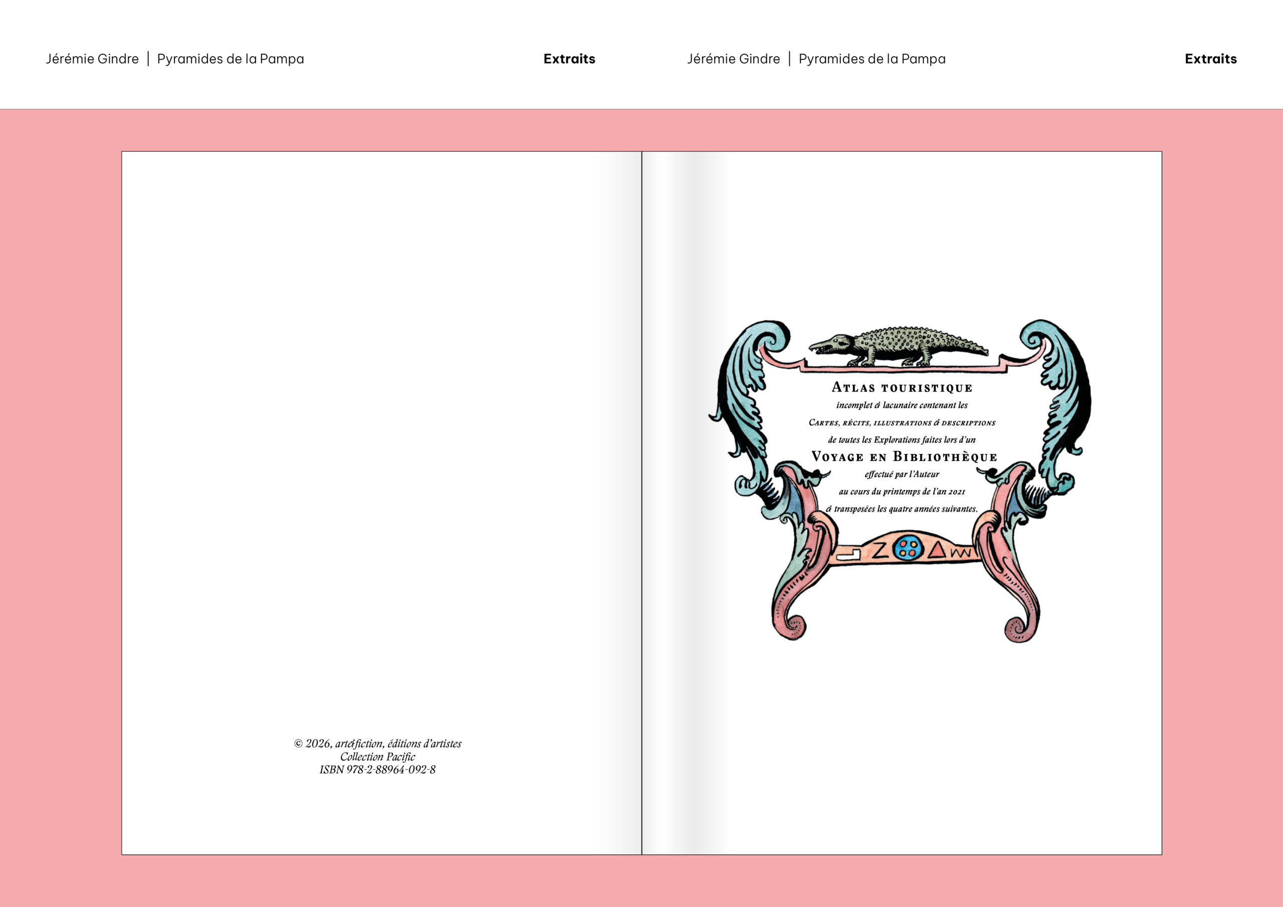 Pyramides de la Pampa est un livre d’images et de textes qui prend la forme d’un atlas. Il a été écrit et dessiné à partir de documents provenant, pour la plupart, des collections de la Bibliothèque de Genève. Ces sources historiques ont été retravaillées pour construire le récit fragmenté d’un monde étranger, ravivant le goût du mystère et de l’inconnu. Sorte de grand voyage en bibliothèque, cet atlas nous guide dans les imaginaires géographiques d’une époque et d’une société, pour mieux en souligner le pouvoir de fiction. Les cartes, schémas, tableaux comparatifs, vignettes et réclames nous présentent des territoires familiers qui paraissent pourtant ici découverts comme au premier jour, dominés par un exotisme à la fois racoleur et inquiétant. Promettant monts et merveilles autant que risques et périls, Atlas touristique des Pyramides de la Pampa (son titre complet) décrit et raconte un monde qui n’a jamais existé, sauf dans les livres.