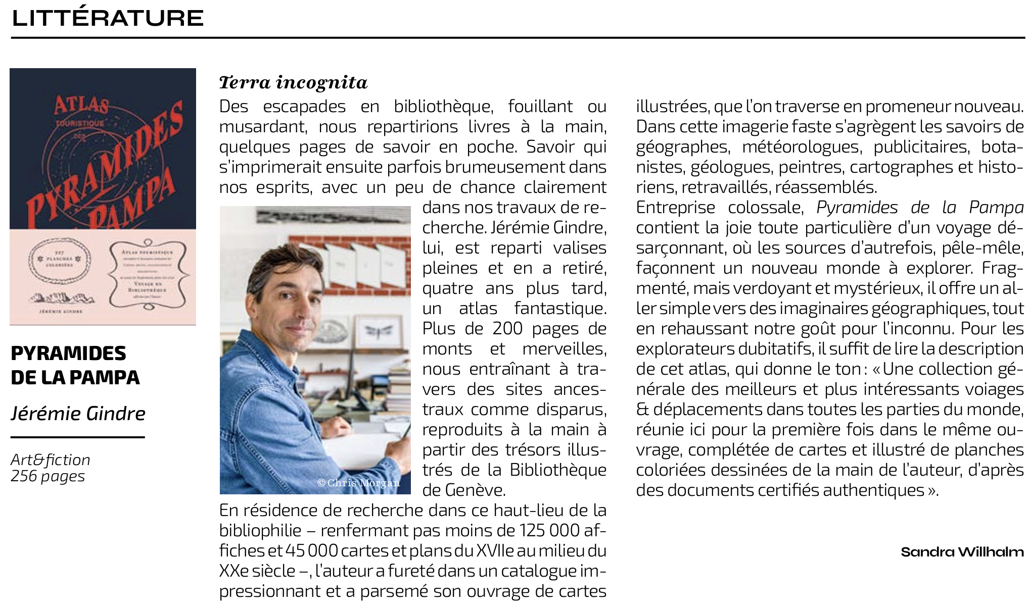 Pyramides de la Pampa est un livre d’images et de textes qui prend la forme d’un atlas. Il a été écrit et dessiné à partir de documents provenant, pour la plupart, des collections de la Bibliothèque de Genève. Ces sources historiques ont été retravaillées pour construire le récit fragmenté d’un monde étranger, ravivant le goût du mystère et de l’inconnu. Sorte de grand voyage en bibliothèque, cet atlas nous guide dans les imaginaires géographiques d’une époque et d’une société, pour mieux en souligner le pouvoir de fiction. Les cartes, schémas, tableaux comparatifs, vignettes et réclames nous présentent des territoires familiers qui paraissent pourtant ici découverts comme au premier jour, dominés par un exotisme à la fois racoleur et inquiétant. Promettant monts et merveilles autant que risques et périls, Atlas touristique des Pyramides de la Pampa (son titre complet) décrit et raconte un monde qui n’a jamais existé, sauf dans les livres.