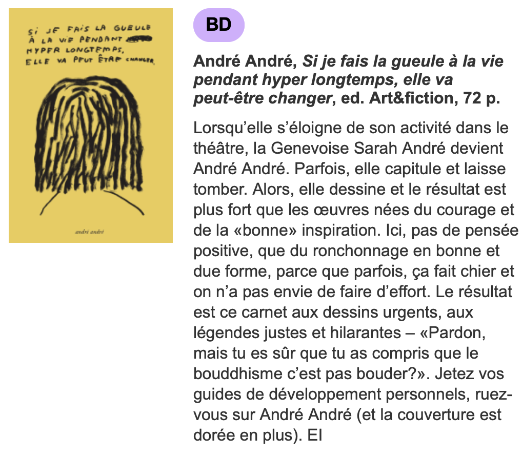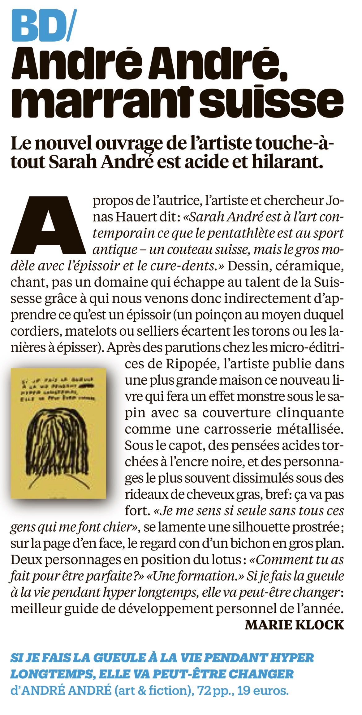 Entre le carnet de dessin et le roman graphique, les œuvres de André André parlent de la difficulté à accepter, soi, la vie, les autres. Avec un humour tendre et brutal (qui touche parfois au désespoir), elle dresse le constat qu’on a déjà fait la gueule à la vie pendant assez longtemps, et comme elle ne changera pas de si tôt, autant s’y installer en riant. De cette narration fragmentaire se dégage une énergie puissante. Dans cette parade où l’absurde le dispute à la joie, la dessinatrice n’hésite pas à dire sa colère en passant de la poésie mélancolique à la blague clownesque. Une brutalité nécessaire face à cette histoire dégueulasse qu’est la vie, comme le chantait le groupe Alice qu’elle a co-créé. C’est aussi la précision graphique qui crée la portée comique: le trait devient à certains moments incontrôlable – entre le freinage maîtrisé et le dérapage imprévu!